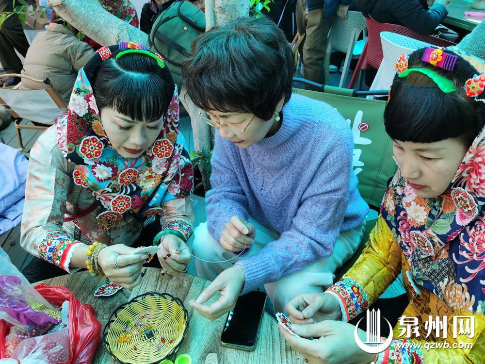 像朱女士这样的游客越来越多,他们通过购买缀仔等惠女特色文创商品,深入了解惠安文化,还有人直接“上手”,沉浸式体验惠安女的日常。来自厦门的沈先生为妈妈挑选了两块惠女头巾,还购买了制作缀仔的材料,现场DIY起来。在他看来,缀仔是很不错的时尚单品,可以别在风衣或围巾上,既有惠安的文化味,又能让日常穿搭更出挑。