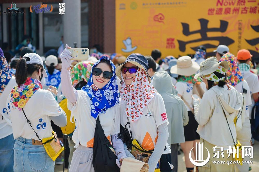 到惠安崇武古城参与徒步活动的游客戴上了头巾与缀仔
