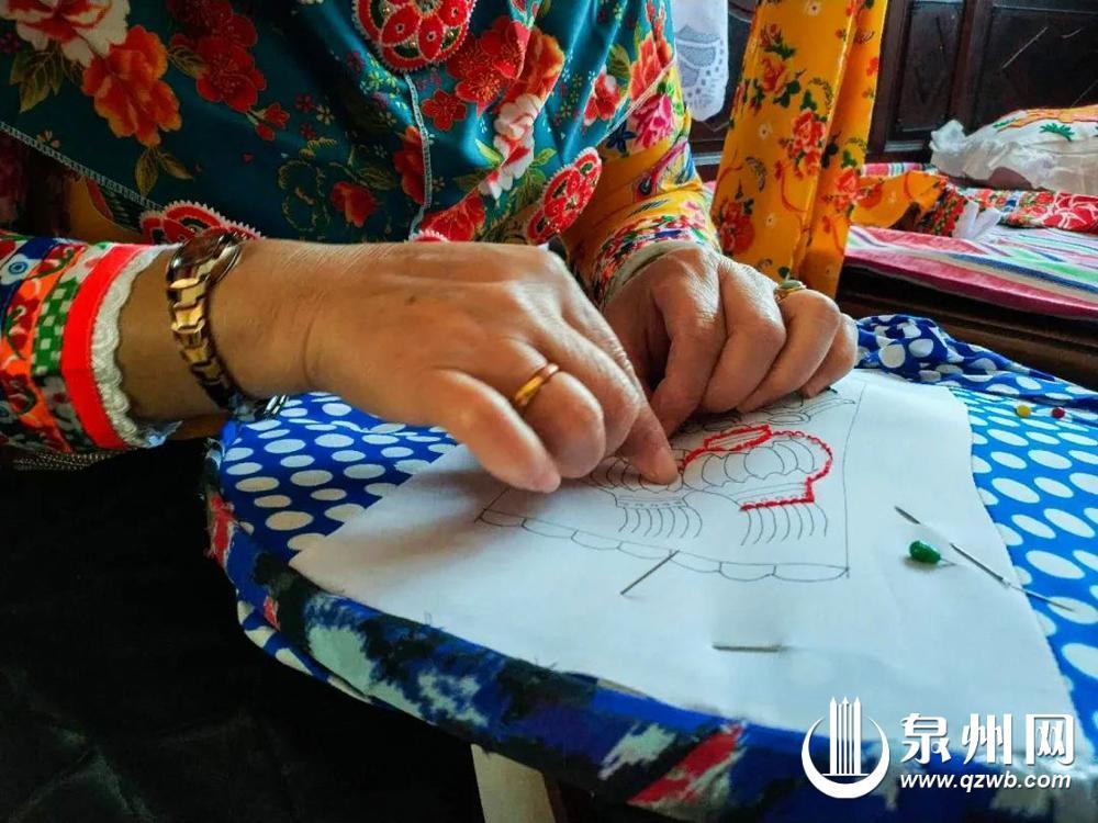 毛线绣缀仔的制作过程颇为讲究。图为惠安女沿着画好的线稿,用辫绣绣出图案的轮廓。