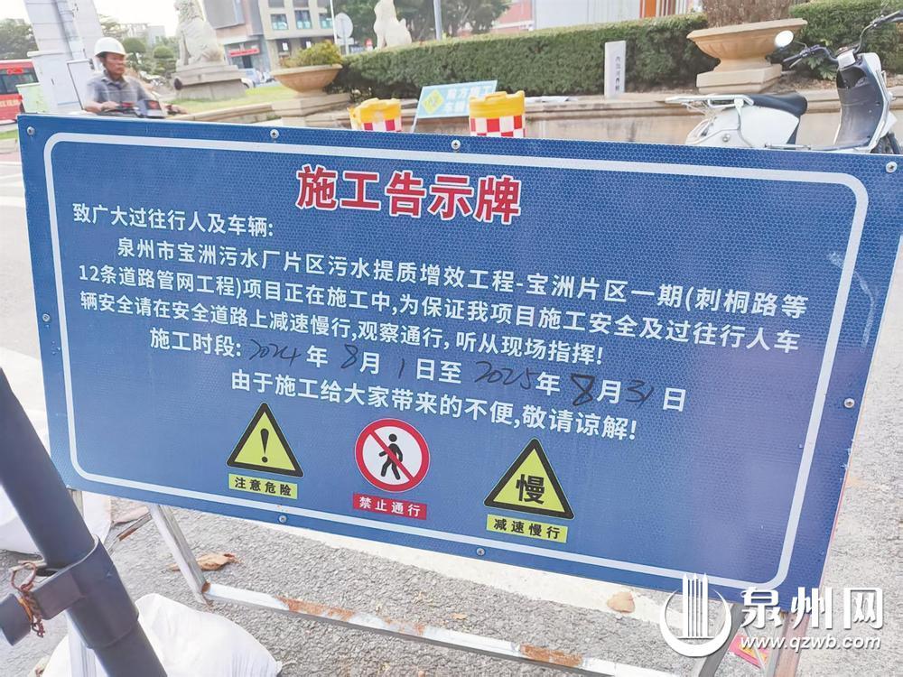 记者走访刺桐南路看到,施工现场也放置了一块“工程概况牌”,上面显示:泉州市宝洲污水厂片区污水提质增效工程宝洲片区一期(刺桐路等12条道路管网工程)开工日期2024年7月1日,计划竣工日期2025年10月8日。那么,刺桐南路目前究竟进展如何?