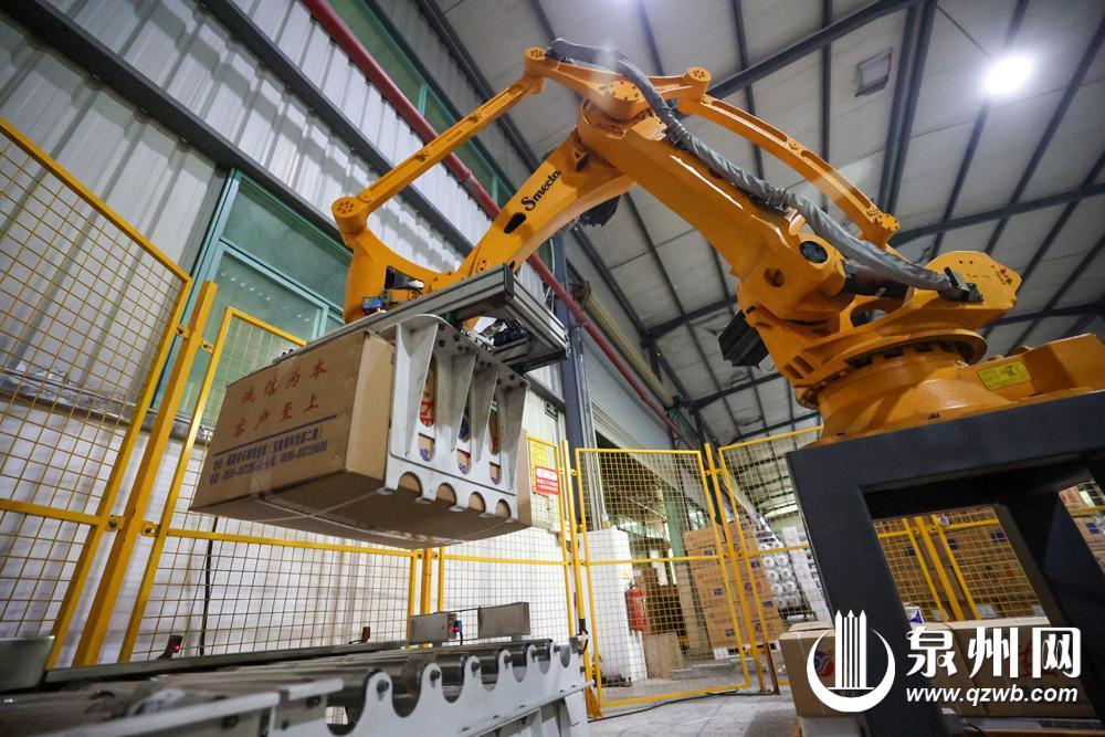 近年来,泉州市纺织服装企业积极发展新质生产力,加速智能车间建设,自动化、信息化、智能化水平持续提升。日前,石狮市益盛化纤织造有限公司引入智能化打包码垛线,机器人“上岗”作业,大幅提高包装质量稳定性与工作效率,成为企业生产提效、转型升级的“得力助手”。(融媒体记者陈小阳 王树帆 通讯员颜华杰 摄)