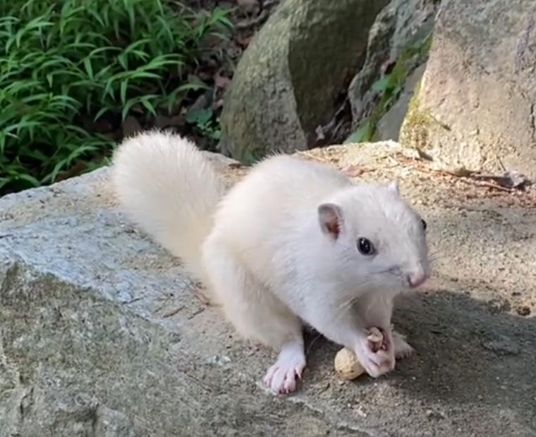白色松鼠抱起花生(视频截图)