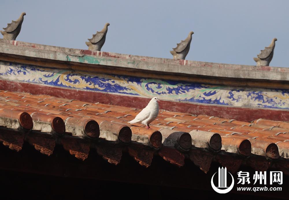 开元寺大雄宝殿的屋脊上,站着一群特殊的“氛围组”——不是龙、凤、狮子这些常规脊兽,而是一只只白鸽。它们艺名“翼不动・咕咕侠”,曾凭“以假乱真”拿下“真假鸽王”冠军。其实,这些白鸽的背后藏着一段“白鸽听经”的传说。