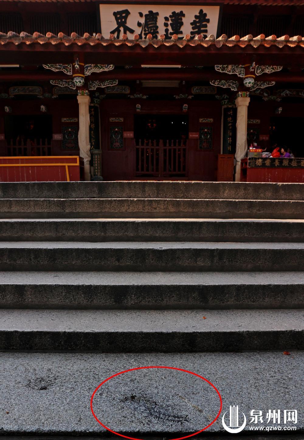 这只蜈蚣刻得很细,头尾触须清晰,独个儿趴在石阶上,旁边啥也没有。关于它的来历,有个传说:郑成功的父亲郑芝龙为保佑儿子出海,听高僧指点,在大雄宝殿重建时埋了两只蜈蚣镇邪。但问遍寺里师父和泉州学者,都没在书上见过相关记载。而另一个说法则来自寺中僧人,据说当年大雄宝殿重修,上梁总也上不去。有人说寺址在“蛇穴位”,得刻只蜈蚣镇住。结果上梁真成了——当然,这也只是老一辈的传说,没有文字记录。