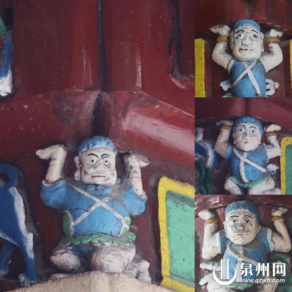 这些“憨番”多在寺庙、石塔中出现,普通民居少见,只有少数“番仔楼”偶能见到。它们大多身着蓝色短上装、绿色短下装,或弯腰或半跪扛着厝角,表情里没有抱怨,只有踏实——像极了那些漂洋过海讨生活的人,把辛苦藏在笑容里,把希望刻进家乡的砖瓦。