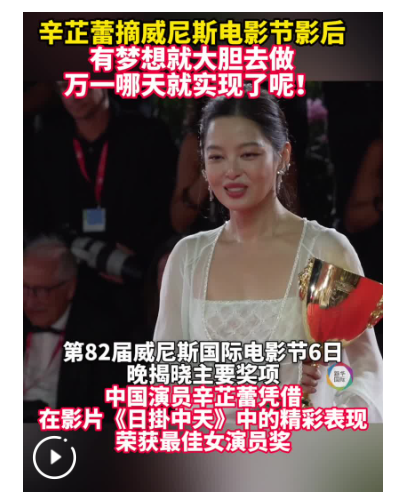 新华社意大利威尼斯9月6日电(记者任耀庭 张馨文 李京)第82届威尼斯国际电影节6日晚揭晓主要奖项,中国演员辛芷蕾凭借在影片《日掛中天》中的精彩表现荣获最佳女演员奖。