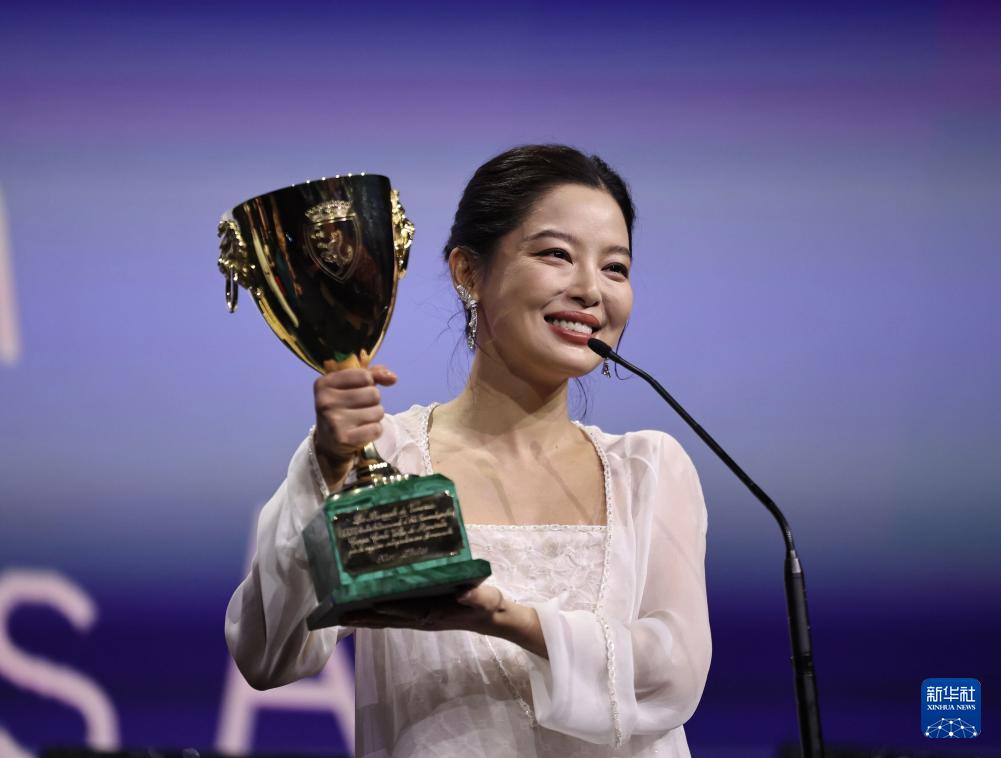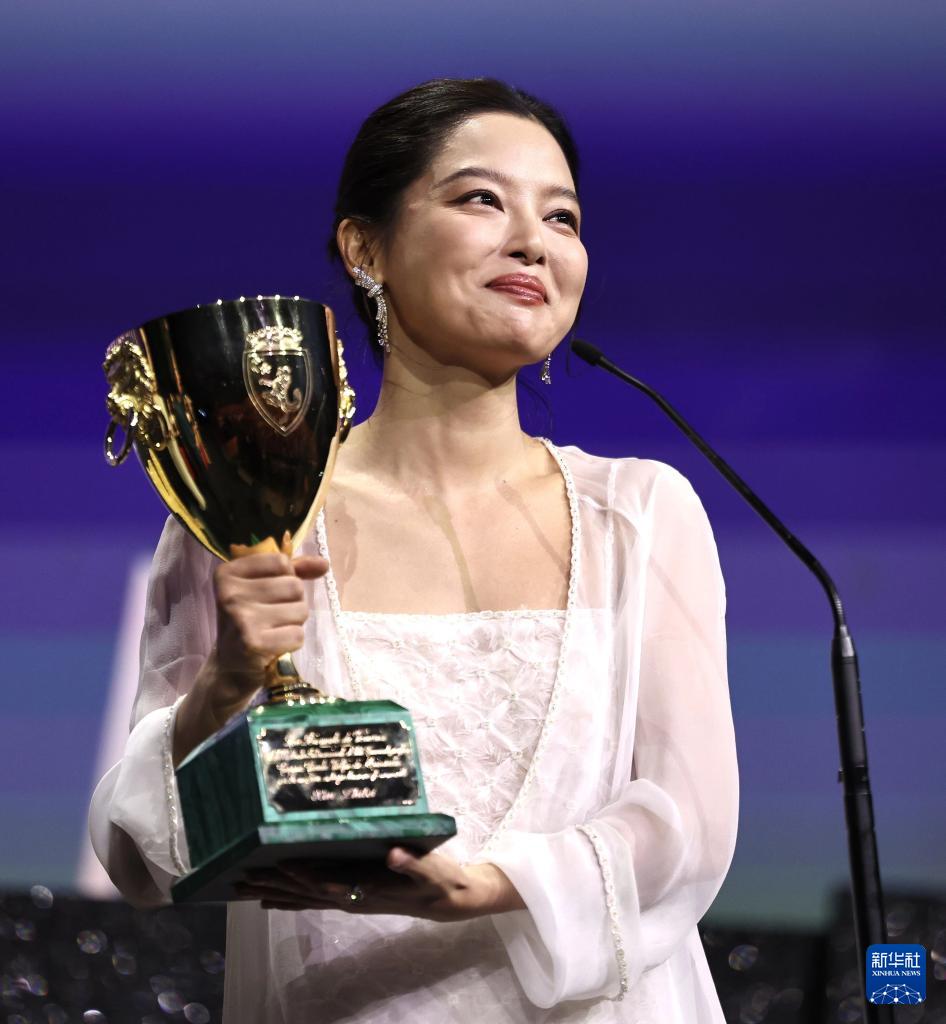 9月6日,在意大利威尼斯,辛芷蕾夺得第82届威尼斯电影节最佳女演员奖。新华社记者 李京 摄