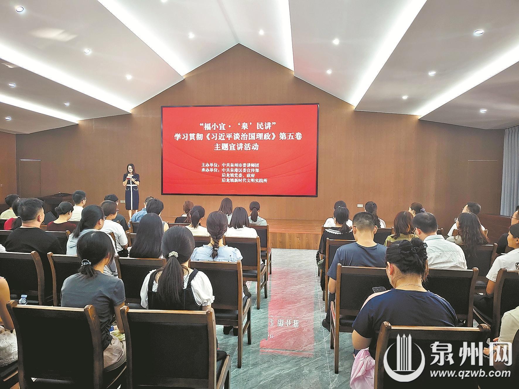本次活动由泉州市委讲师团主办,泉港区委宣传部、后龙镇党委政府、后龙镇新时代文明实践所共同承办。下一步,“福小宣·‘泉’民讲”主题宣讲活动将继续深入基层,走进机关、企事业单位、城乡社区、校园、军营、新经济组织、社会组织和网络空间,在全市持续掀起学习宣传贯彻的热潮,进一步推动党的创新理论“飞入寻常百姓家”。