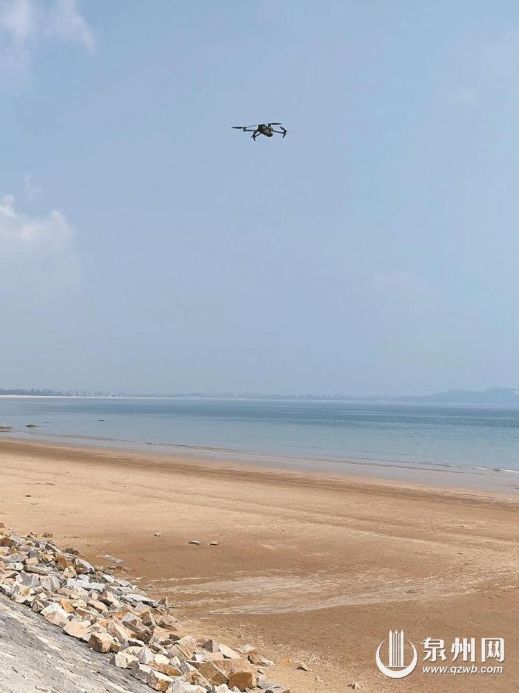 小岞镇用无人机巡查沙滩的海漂垃圾 (融媒体记者陈淑华 摄)