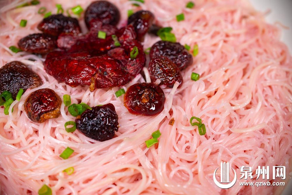 在德化,无论是老人祝寿、孩子过生日,还是各种喜庆宴席,红菇拌面线都是一道颇受欢迎的吉祥菜肴。将面线煮熟后捞出沥干,把洗净的红菇煮熟,在大碗里将处理好的面线和红菇混合均匀,淋上适量红酒,轻轻拌匀,红菇的鲜香与面线的软滑交织,入口满是醇厚滋味,汤底鲜而不腻,每一口都带着自然的清甜。