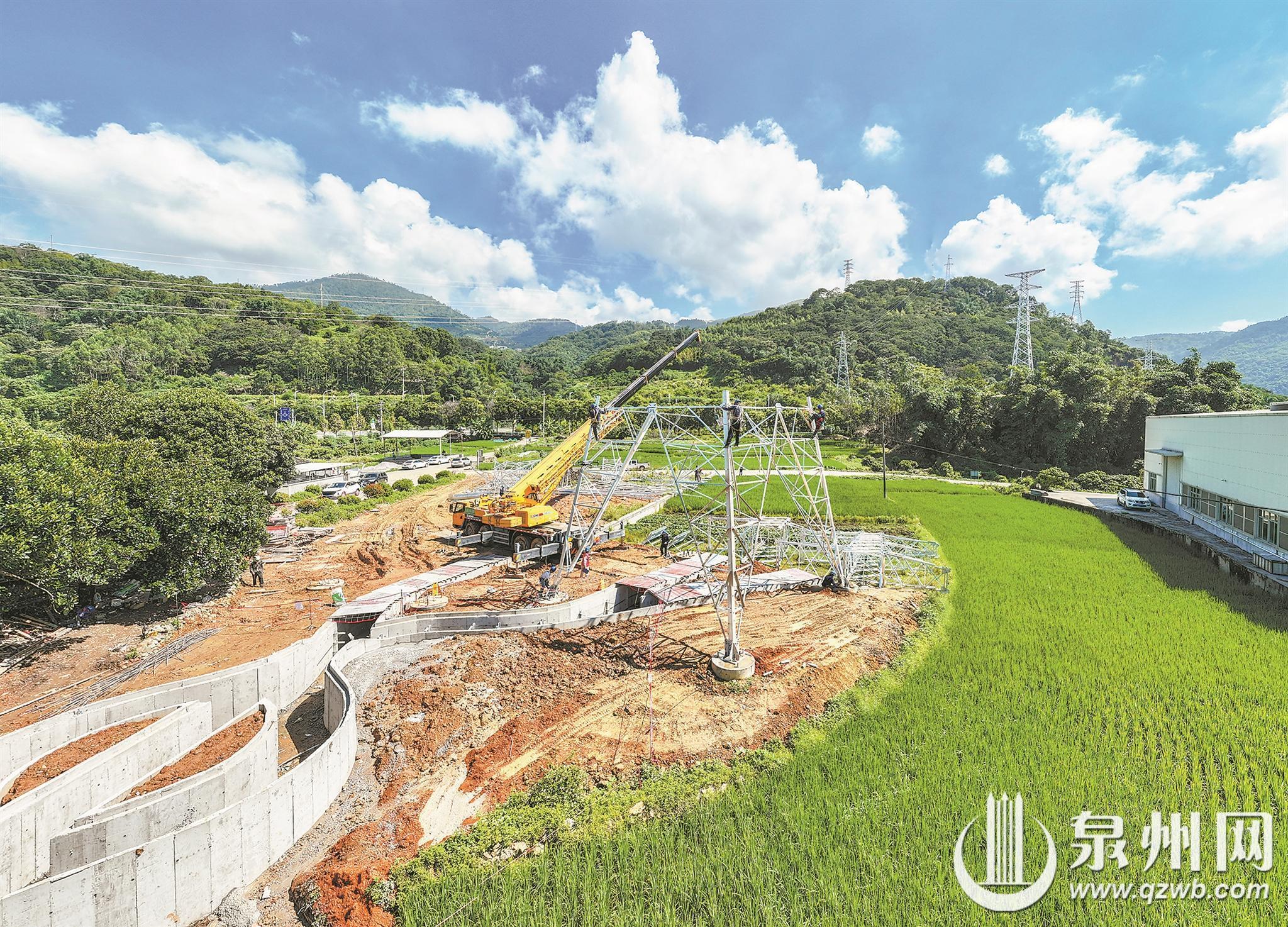 永春积极探索县域低空经济发展新路径、新模式,国网永春县供电公司加快山区电网建设力度,补强末端供电能力,解决低空经济发展面临的用电需求等一系列挑战,推动山区电网形成跨区域供电保障。图为近日,在桃城镇济川110千伏变电站35千伏配套送出工程施工现场,作业人员加快吊装组塔。 (融媒体记者陈小阳 通讯员陈小强 刘文宏 摄)
