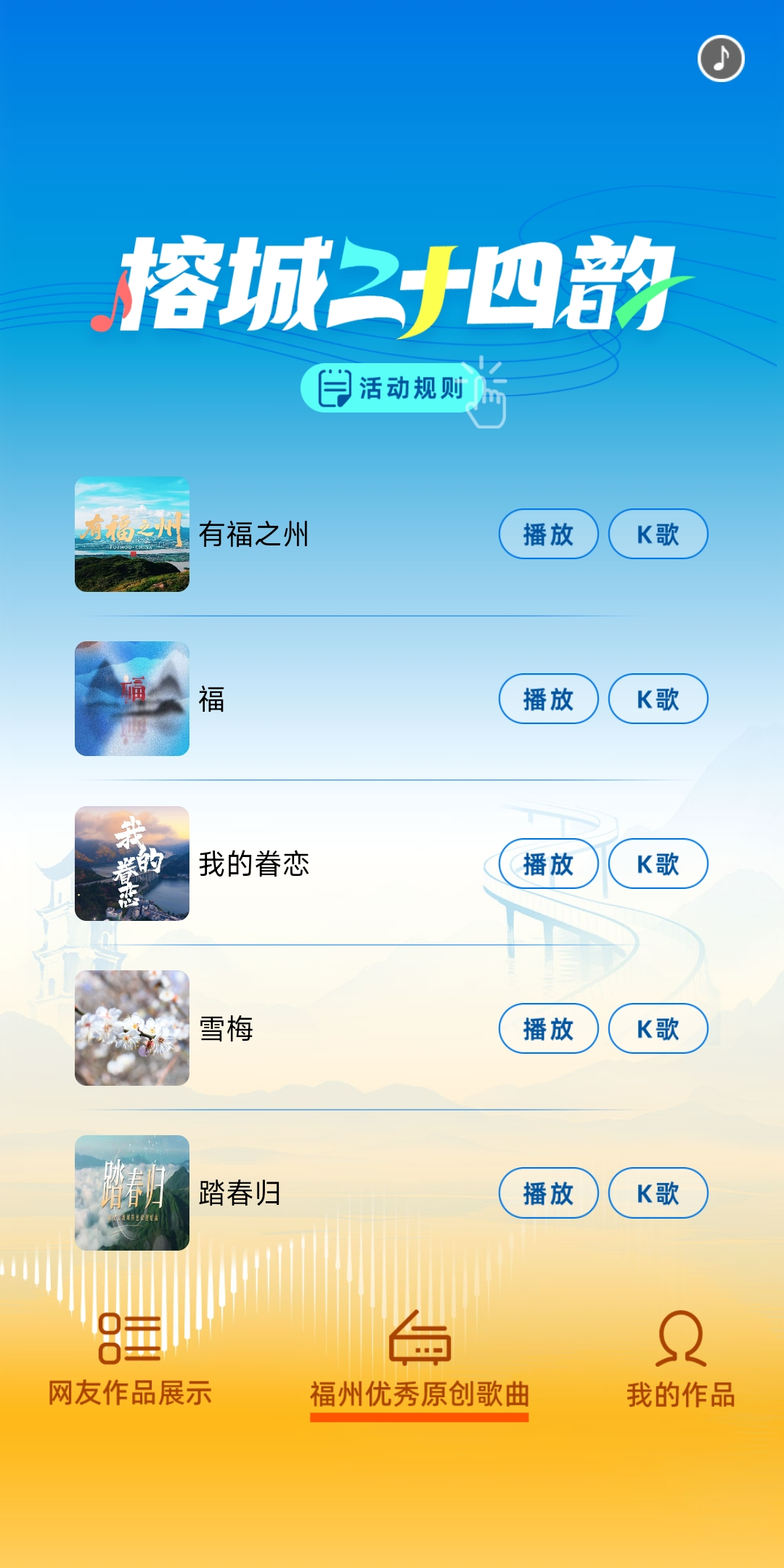 除了大家熟知的《福》《有福之州》《天宝陂》,“唱响福州”小程序还收录了《海峡飞歌》《春拂闽江》《密韵长歌》《水中厝》等一批来自福州各县(市)区饱含深情的本土优秀原创歌曲。