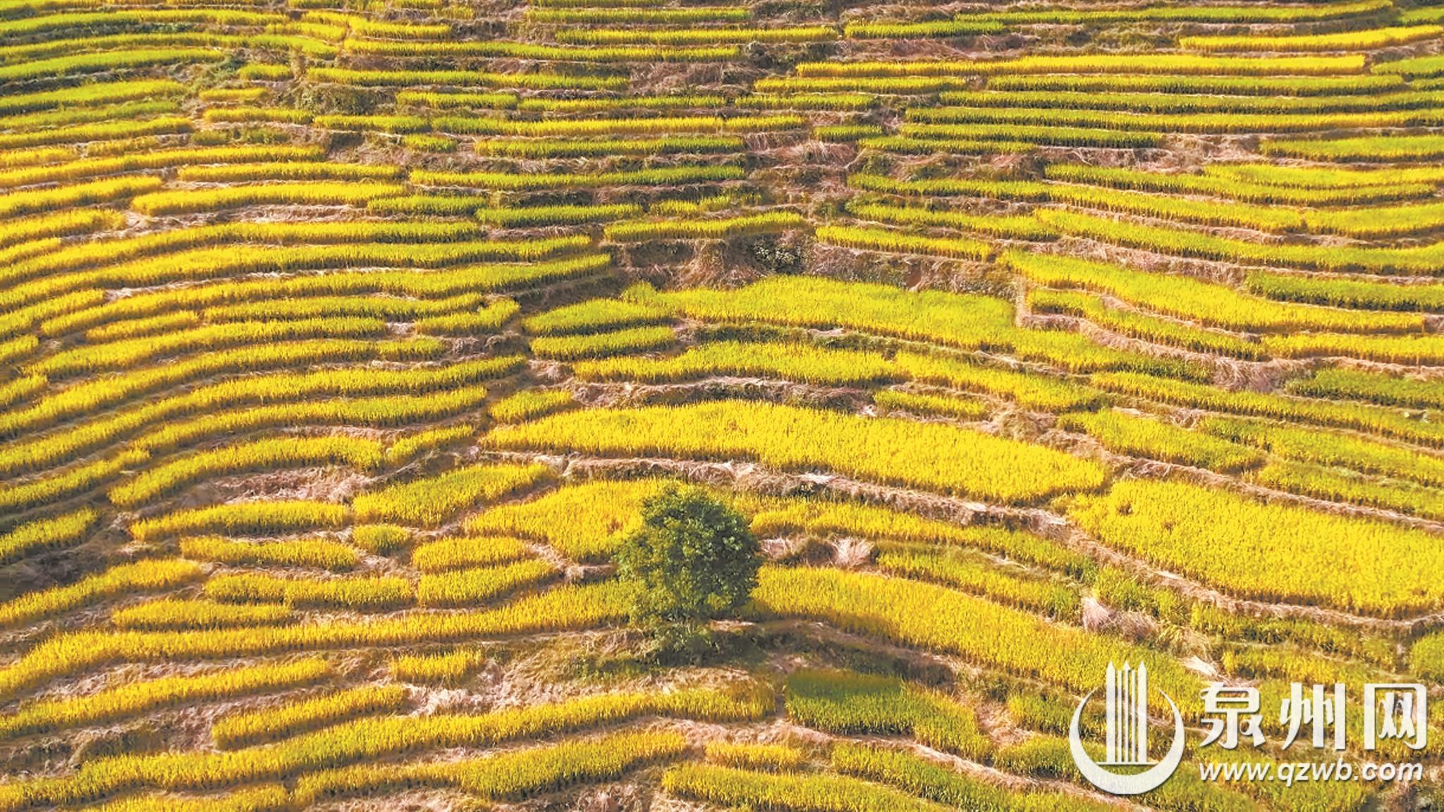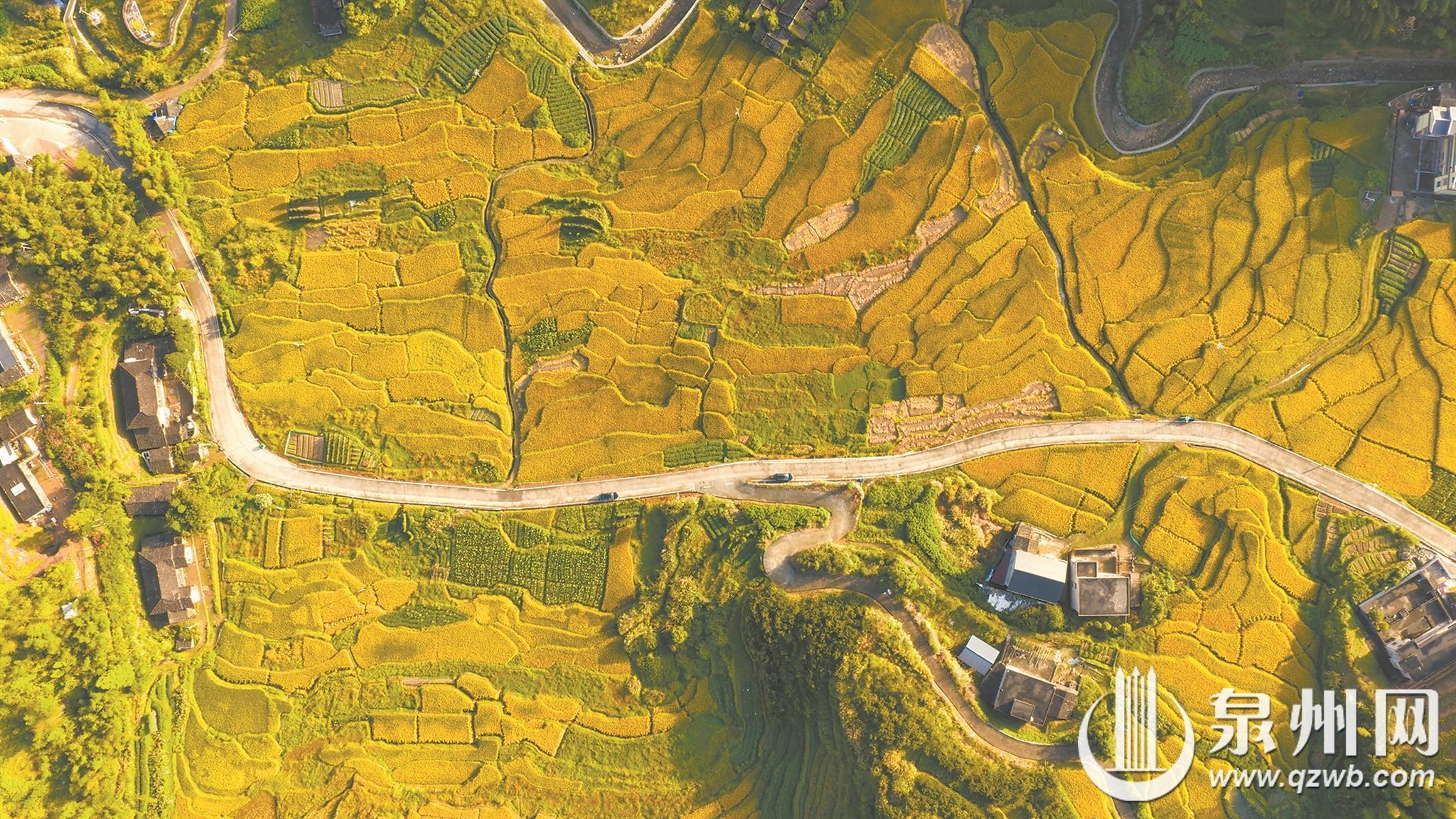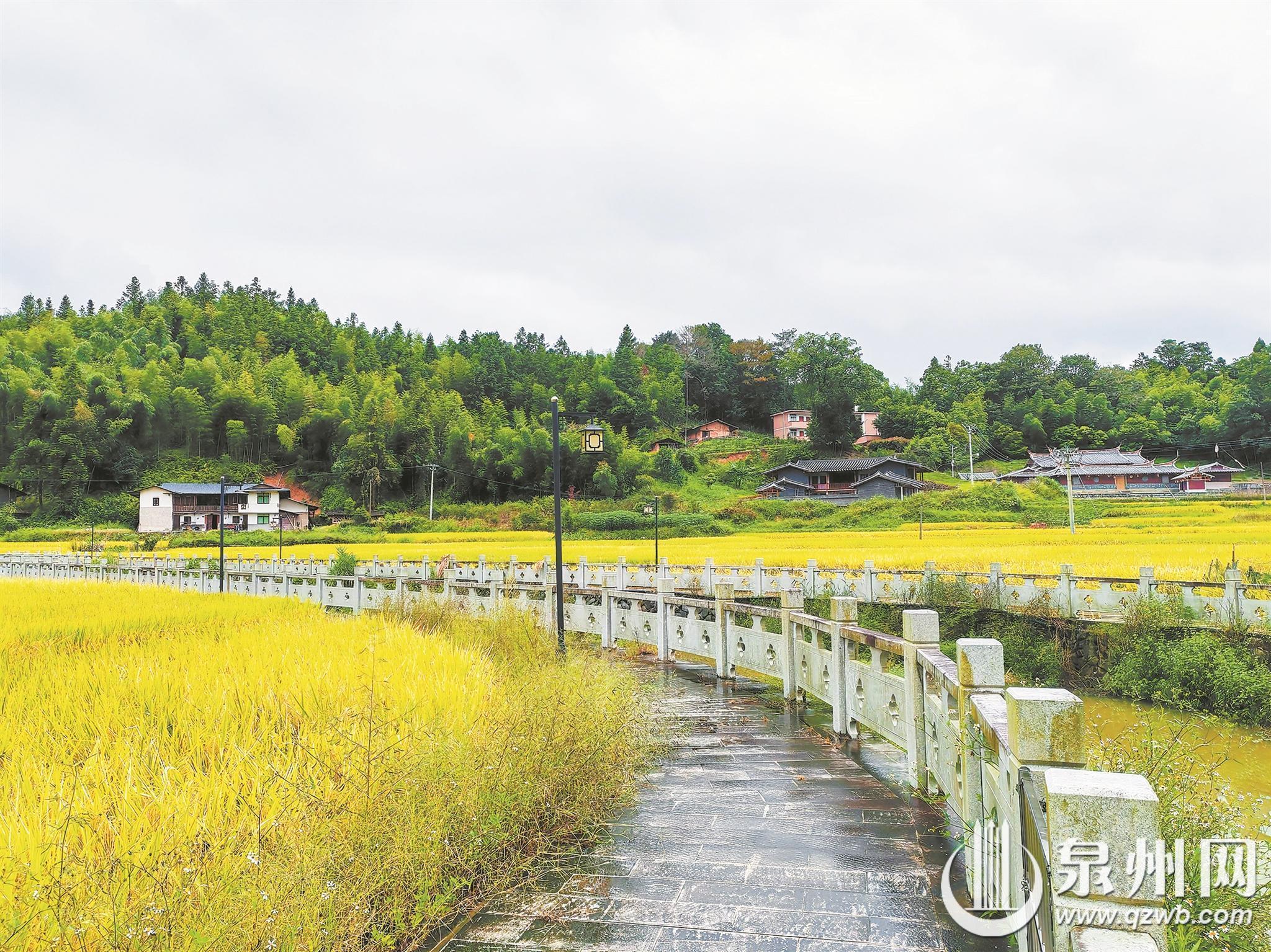 烟雨朦胧中,德化县雷峰镇雷峰村仿佛披上一层轻纱。沿着石板小径漫步,映入眼帘的是漫山遍野的金色梯田,犹如大地的鎏金织锦,在细雨微风中泛起层层涟漪。溪水潺潺流过,与黛瓦民居、苍翠林海交织成一幅动人的水墨田园画。