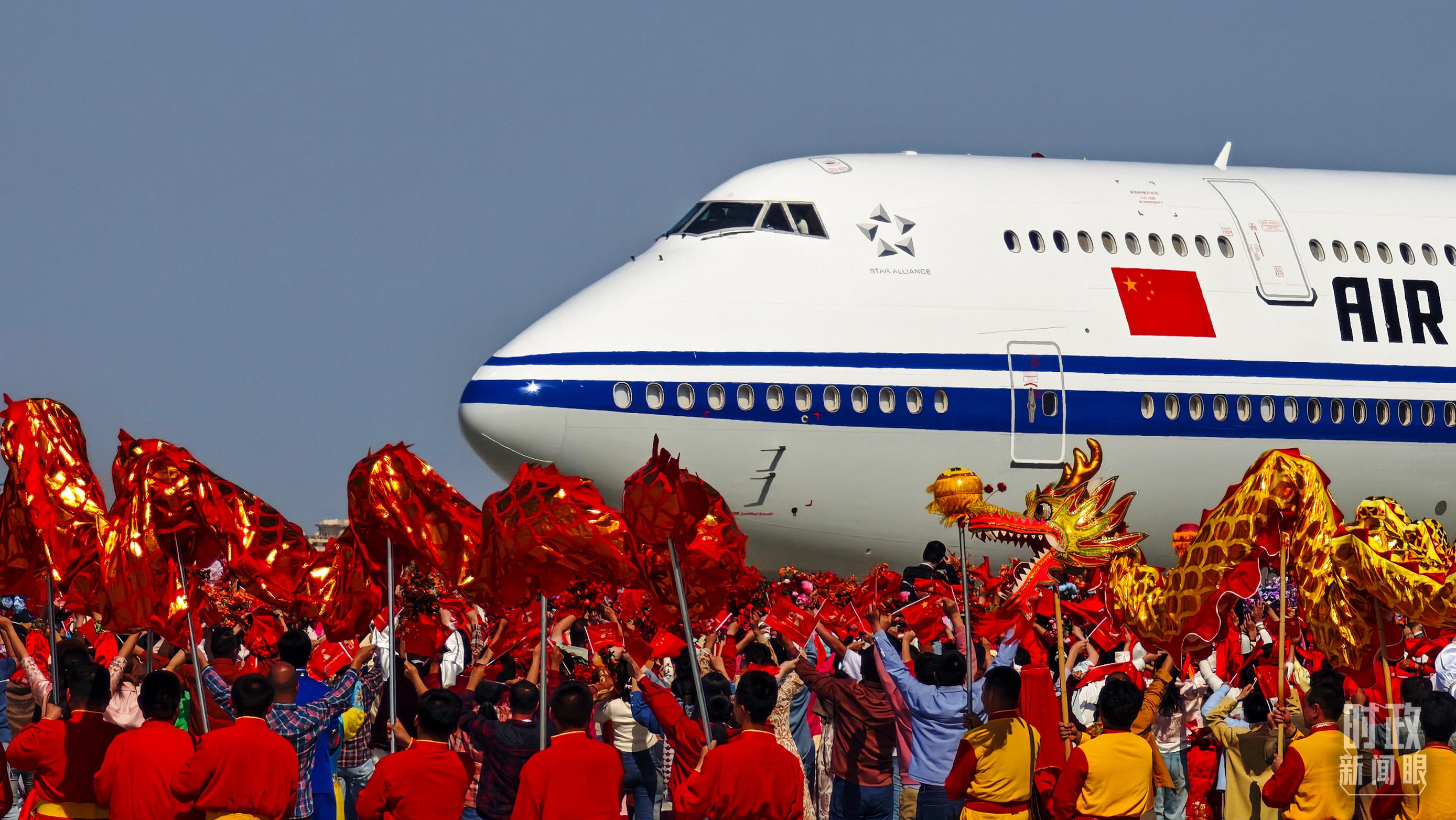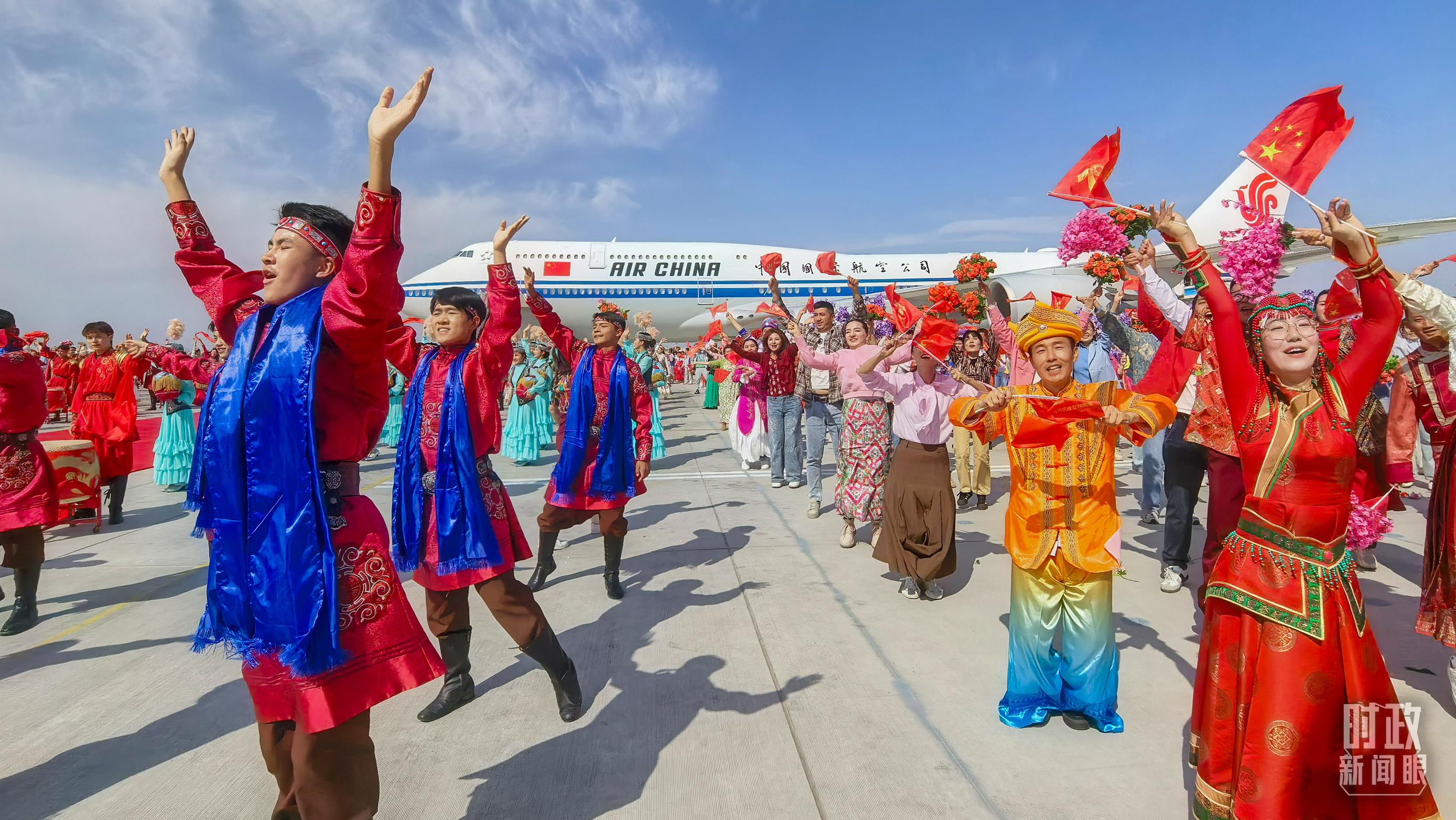 在机场,各族群众代表身着民族服饰,载歌载舞。从机场到住地,各族群众手持红旗,热情欢呼,表达对总书记的欢迎和感激之情。