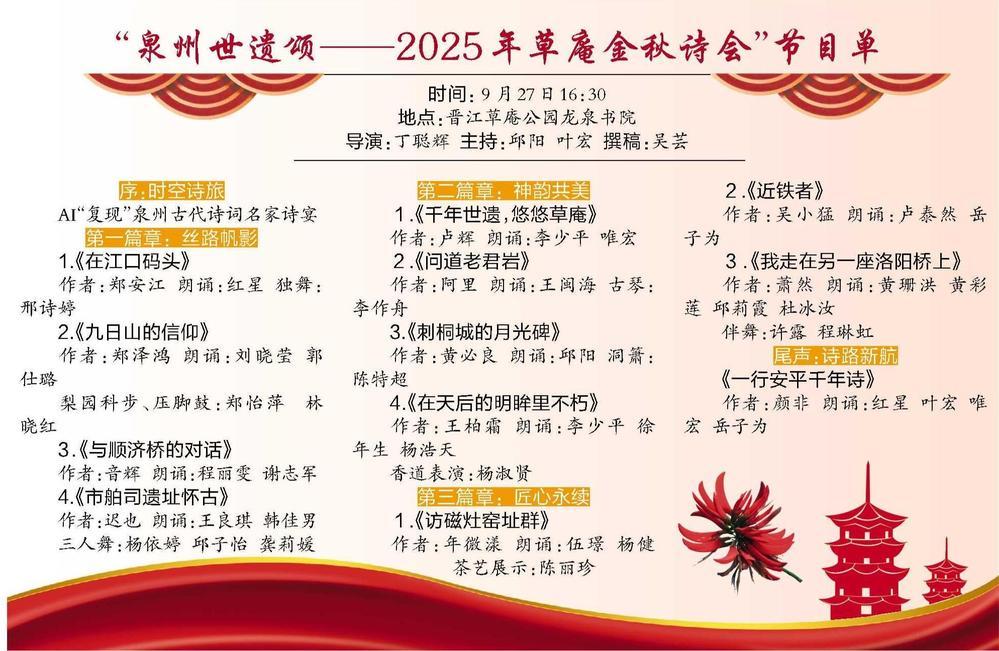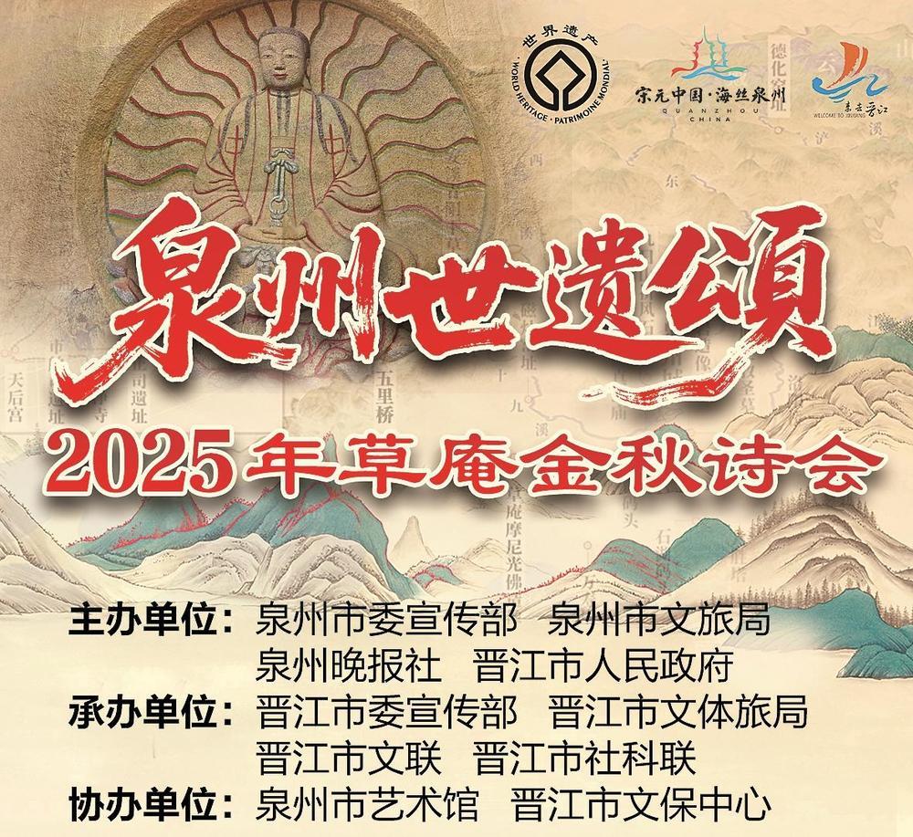 “泉州世遗颂——2025年草庵金秋诗会”由泉州市委宣传部、泉州市文旅局、泉州晚报社、晋江市人民政府联合主办,晋江市委宣传部、晋江市文体旅局、晋江市文联、晋江市社科联联合承办,泉州市艺术馆、晋江市文保中心协办。本届诗会自6月25日2025年泉州市文旅经济发展大会开幕当天正式启动海内外诗歌征集活动以来,共收到来稿573件,投稿作者来自10多个国家、覆盖全国大部分省(市),参与者众、覆盖面广、影响力大。评委会精心遴选56首诗歌进入复评,最终评选出17首获奖作品。这些诗作紧密围绕2025年泉州市文旅经济发展大会“创新发展‘晋江经验’,培育文化旅游支柱产业,打造世界知名旅游目的地”主题,以泉州遗产点入诗,寻古探今,将岁月风云、世遗胜迹、古邑华章融于诗行中,以丰富视角生动展示世遗泉州的城市魅力,展现美好的高品质海丝文化旅游目的地形象。