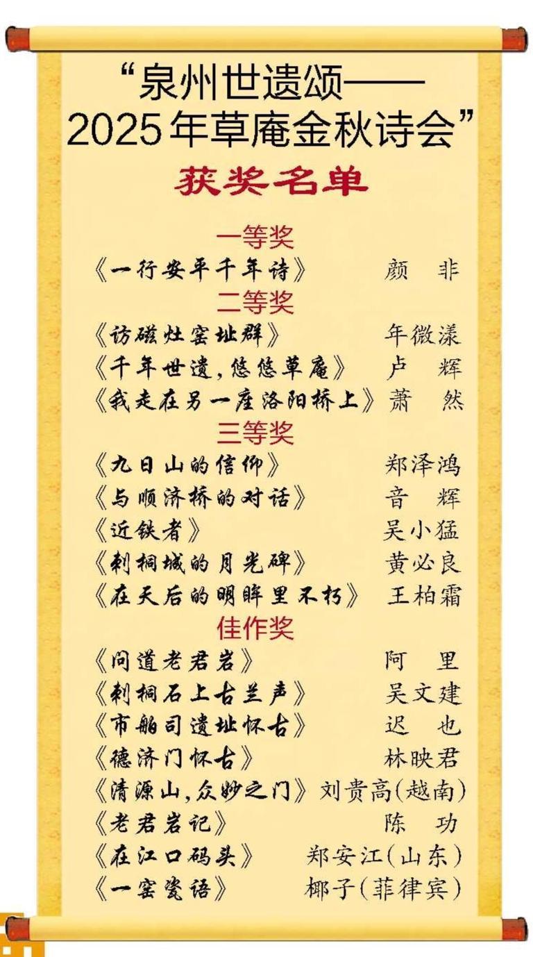 泉州网9月27日讯(融媒体记者吴芸 黄祖祥)《2025年泉州世界遗产点诗歌地图》今日发布,这是泉州晚报社融媒体团队连续第三年以这一经典形式献礼世遗之城,让读者在唯美的诗画构图中,沉浸体验世遗之城的不绝诗意。“泉州世遗颂——2025年草庵金秋诗会”评选结果同步揭晓,来自海内外的17位诗人获奖。