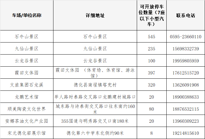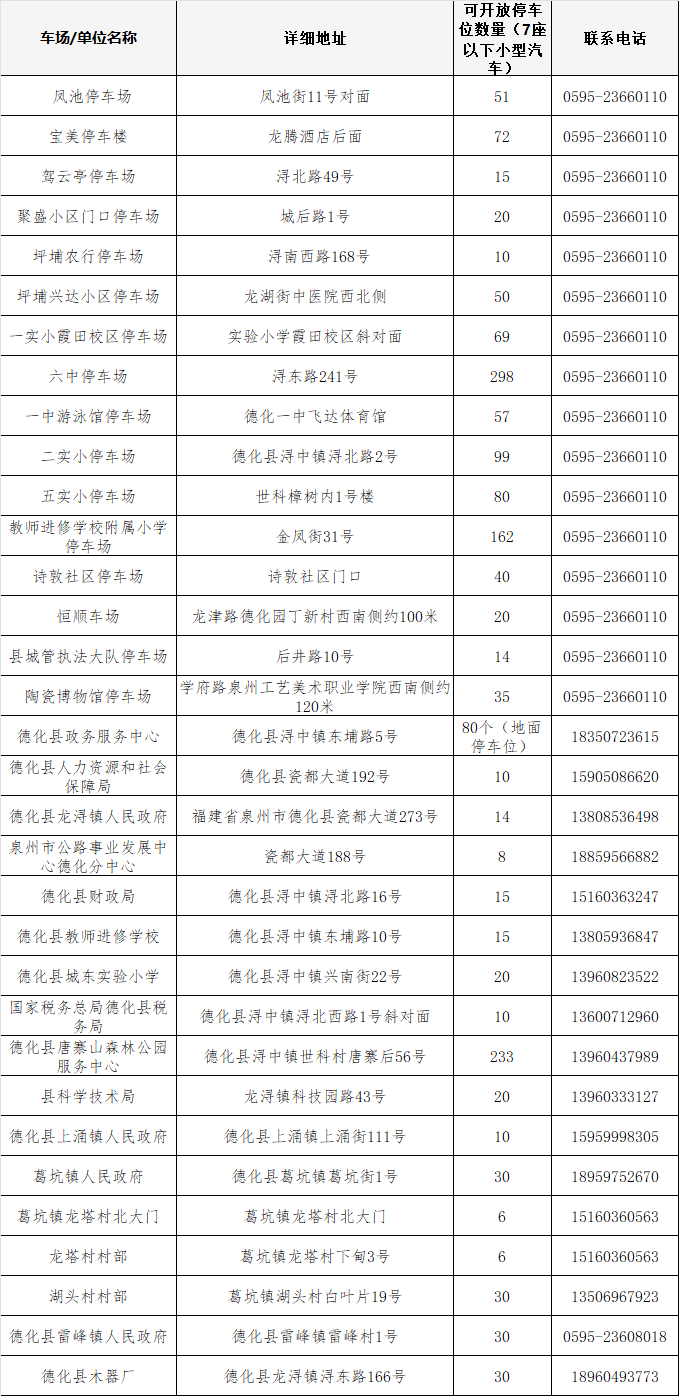 2.全县公共停车场及部分党政机关企事业单位内部停车场。车场名称、详细地址、可开放停车位数量等信息详见下表。