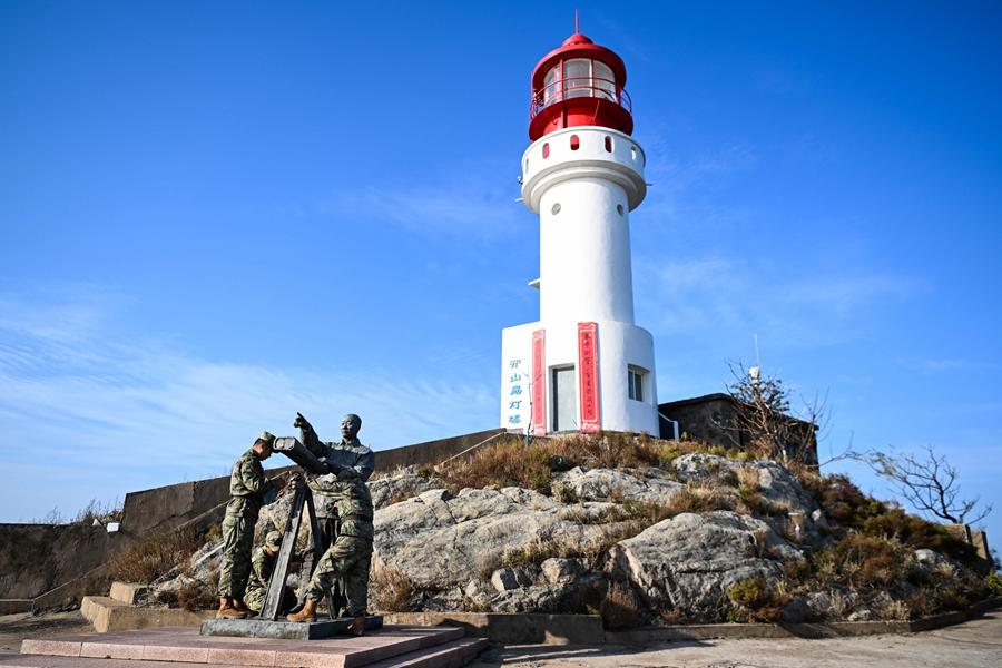 开山岛守岛民兵保养清洁王继才雕像(2024年10月25日摄)。新华社记者 邓华 摄