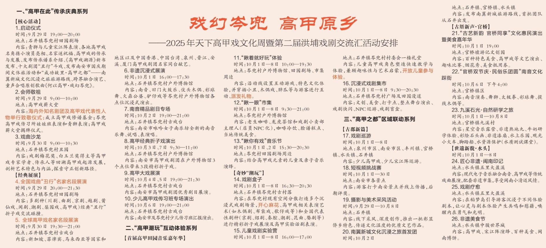 此次活动以“戏幻岑兜 高甲原乡”为主题,精心打造“高甲在此”“高甲潮玩”“‘高甲’之都”三大核心板块、汇聚26场特色活动,全方位展现高甲戏的魅力与活力,为期10天的活动将为市民游客呈现一场兼具传统底蕴与现代潮流的文化盛宴。