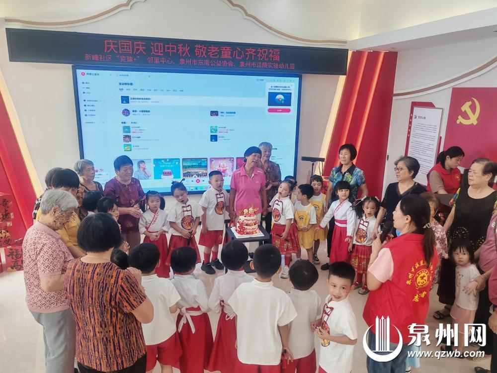 泉州网9月30日讯(融媒体记者高云 陈茗香 文/图)9月29日上午,在国庆与中秋双节来临之际,泉州市东南公益协会联合新峰社区、泉州市温陵实验幼儿园,在鲤城区鲤中街道新峰社区活动中心举办了一场别开生面的“童心伴银龄,共庆好时光”老幼同乐生日会。17名当月生日的老人与30名温陵实验幼儿园的孩子欢聚一堂,共度佳节。