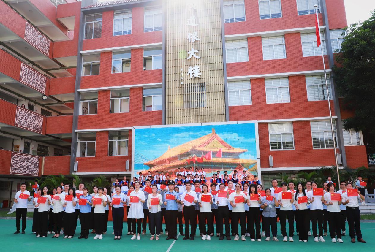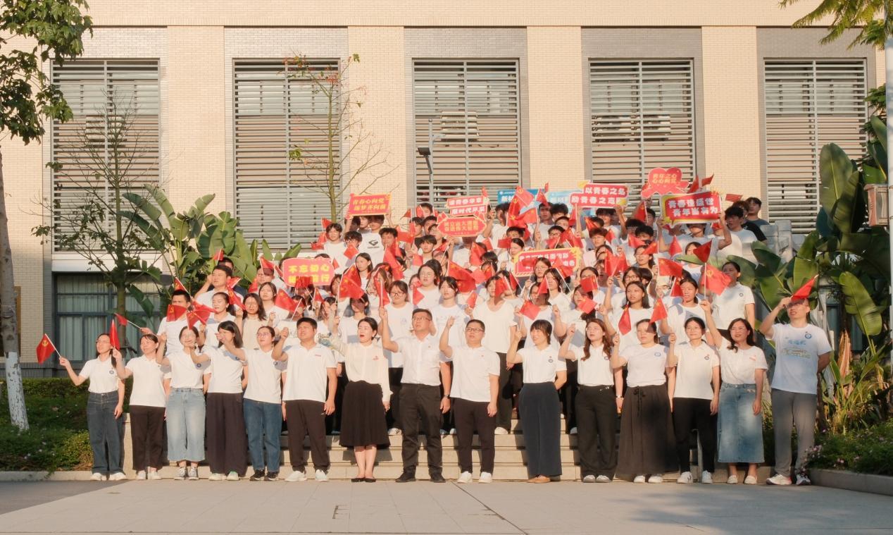 在黎明职业大学分会场,师生们同样热情高涨。新材料与鞋服工程学院师生在教学楼前挥舞国旗,挥动手中的国旗,通过视频连线与主会场进行互动。两边会场红旗飘飘展,歌声交融,情感相同,共同表达对祖国生日的深情祝福,视听交织间,家国情怀深深烙印在每个人心中。