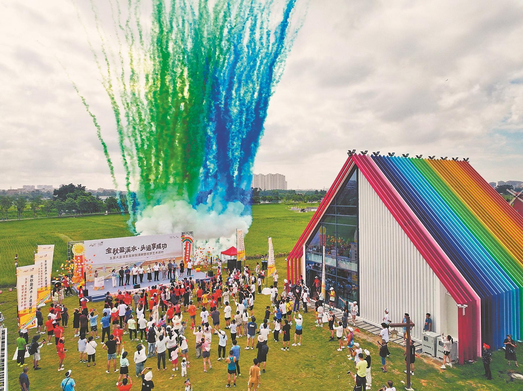 日前,“金秋盈溪水·头运享成功”五里大盈溪首届田园漫跑暨稻梦艺术派对在南安市水头镇启幕。在全程8公里的“成功之路闯关赛”中,游客沿着串联稻梦岛与五里桥文化公园的赛道漫跑,体验5个趣味闯关环节,尽享运动与田园风光交织的丰富乐趣。图为活动启幕现场。