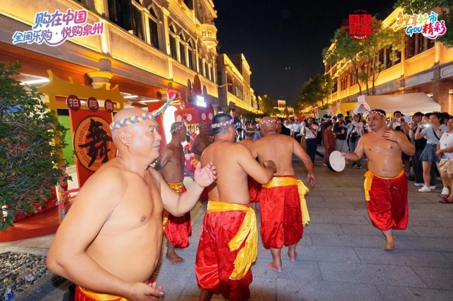 夜幕之下,中山路化为非遗展示舞台,快闪表演精彩不断。提线木偶艺人指尖轻动,木偶随之活灵活现、惟妙惟肖;南音雅乐悠扬回荡,尽显闽南古韵;青狮阵、高甲戏、拍胸舞、火鼎公婆等接连登场,融合高甲戏精髓与武术招式,展现出闽南武魂的独特魅力,令观众目不暇接、赞叹连连。