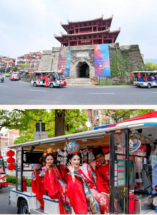 礼成后,新人们乘坐装饰喜庆的“小白”婚车,沿芳草园、源和1916、泉山门等古城地标开启环城巡游。