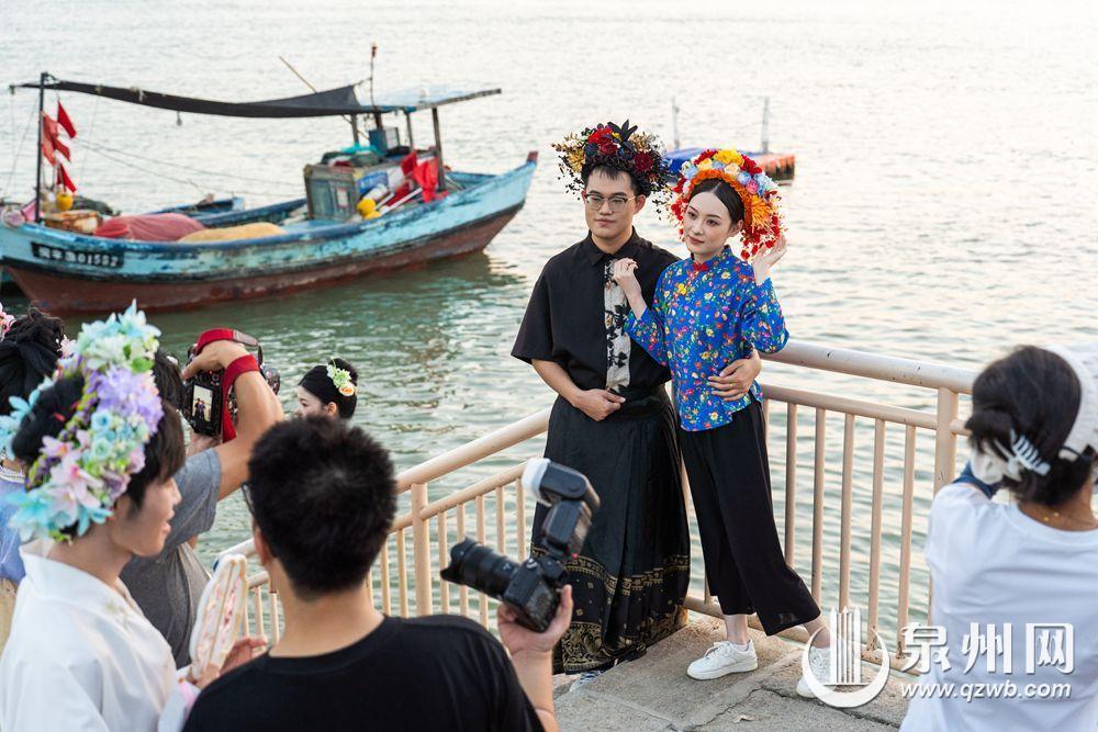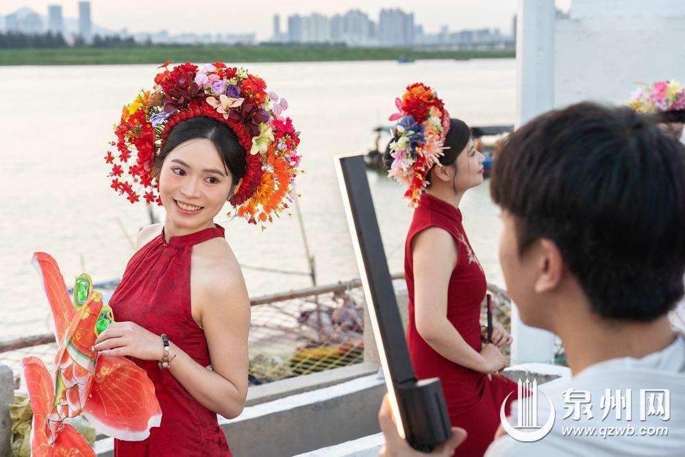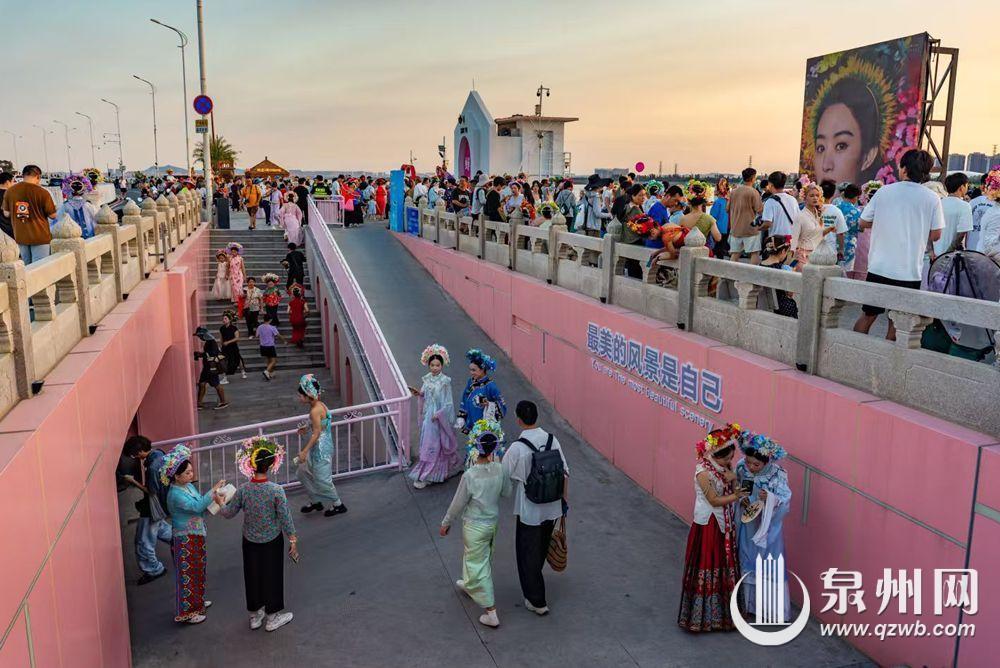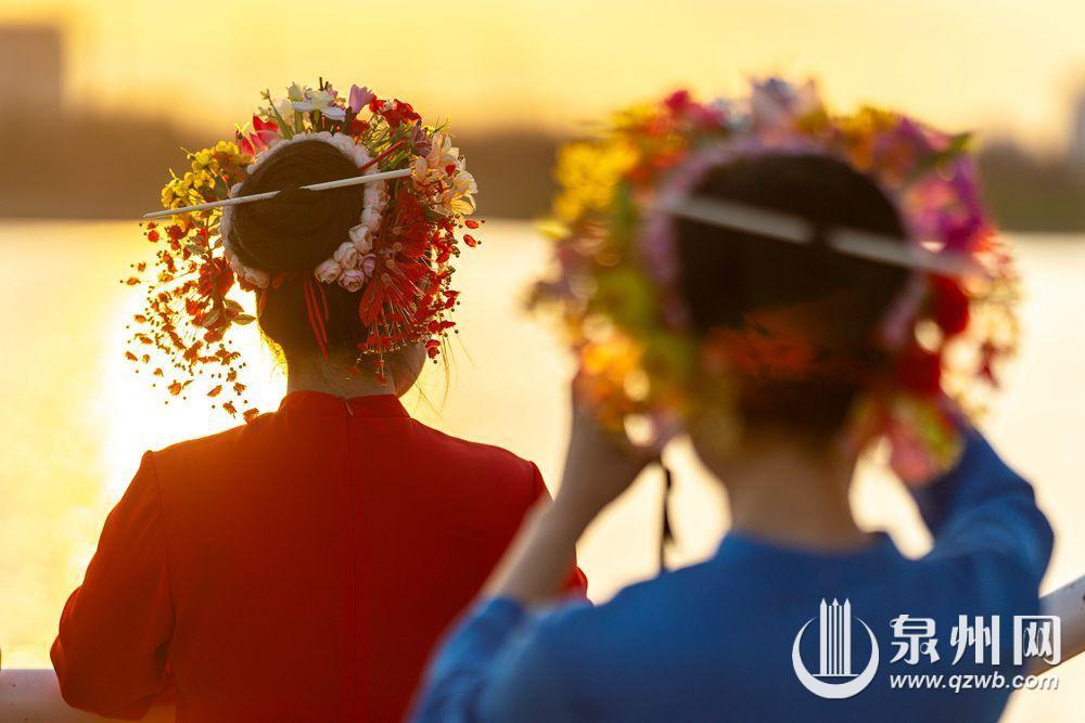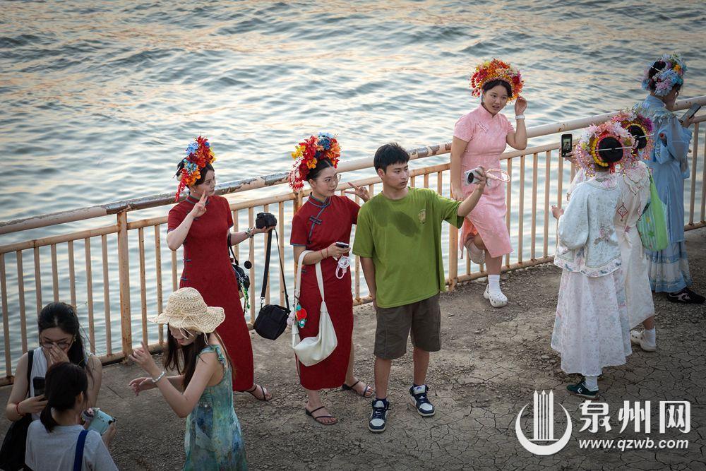 10月2日傍晚,余晖浸染晋江水,丰泽蟳埔码头变身露天影棚,八方游客头戴簪花围,身着华服,在温柔暮色中定格簪花浪漫。江天为幕,清风徐来,造型多变,笑靥如花,快门声中,传统与现代相拥,织就一幅流动的海丝风情画。(融媒体记者:陈起拓 文/图)