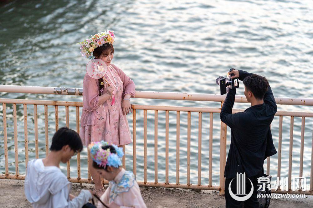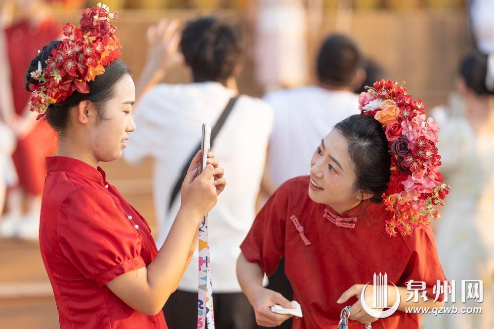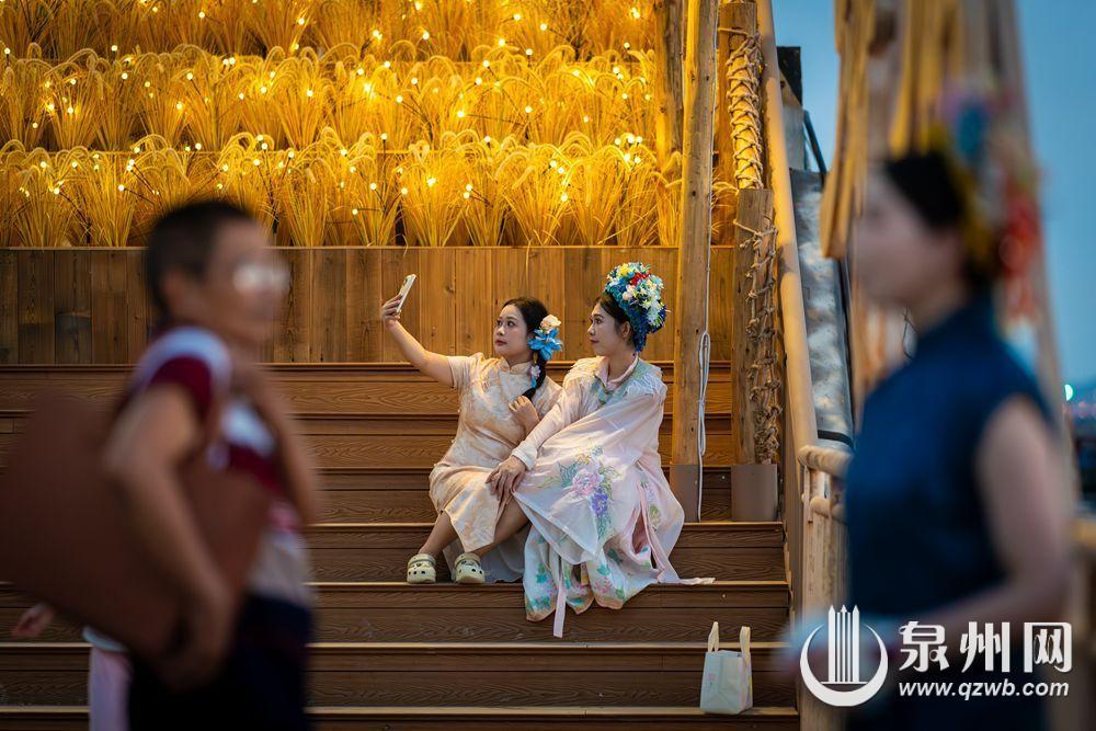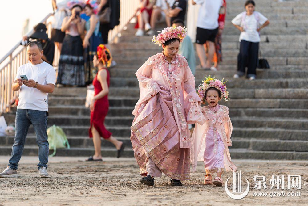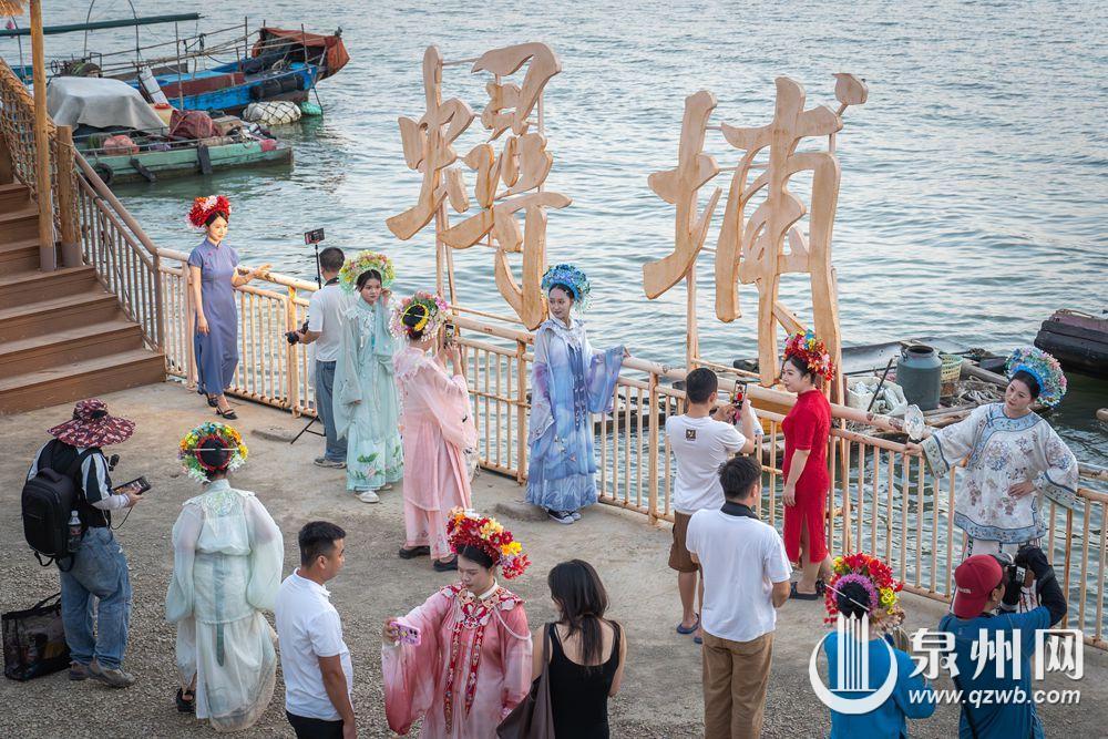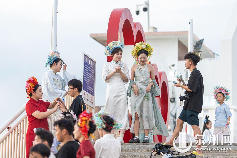 10月2日傍晚,余晖浸染晋江水,丰泽蟳埔码头变身露天影棚,八方游客头戴簪花围,身着华服,在温柔暮色中定格簪花浪漫。江天为幕,清风徐来,造型多变,笑靥如花,快门声中,传统与现代相拥,织就一幅流动的海丝风情画。(融媒体记者:陈起拓 文/图)