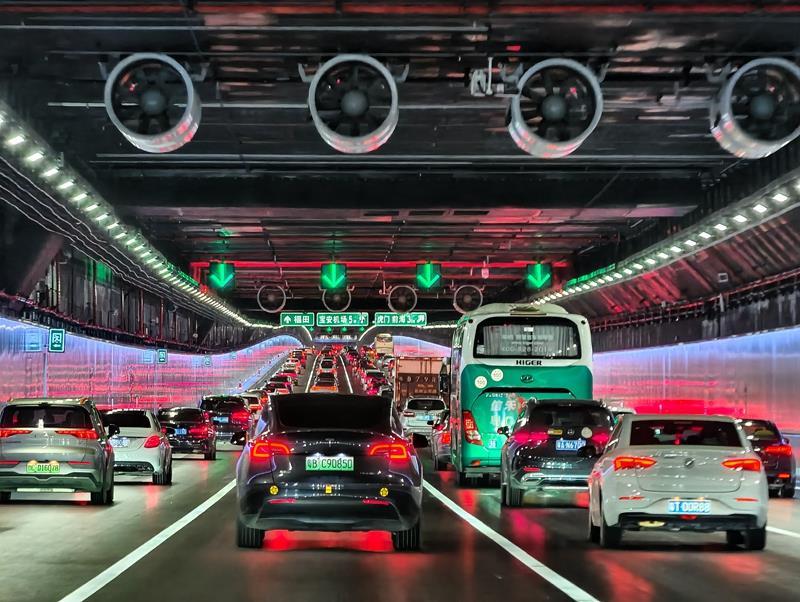 △2024年6月30日,深中通道正式通车,这是开通首日的深中通道海底沉管隧道内的车流。