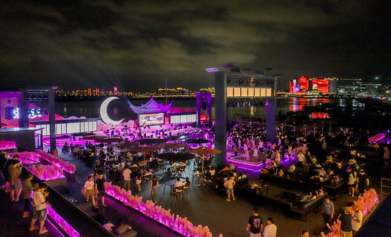 国庆中秋节日期间每晚8点,码头夜空将绽放璀璨烟火,金色火花与紫色夜海交织。每晚专业歌手驻场,流行金曲轮番上演。