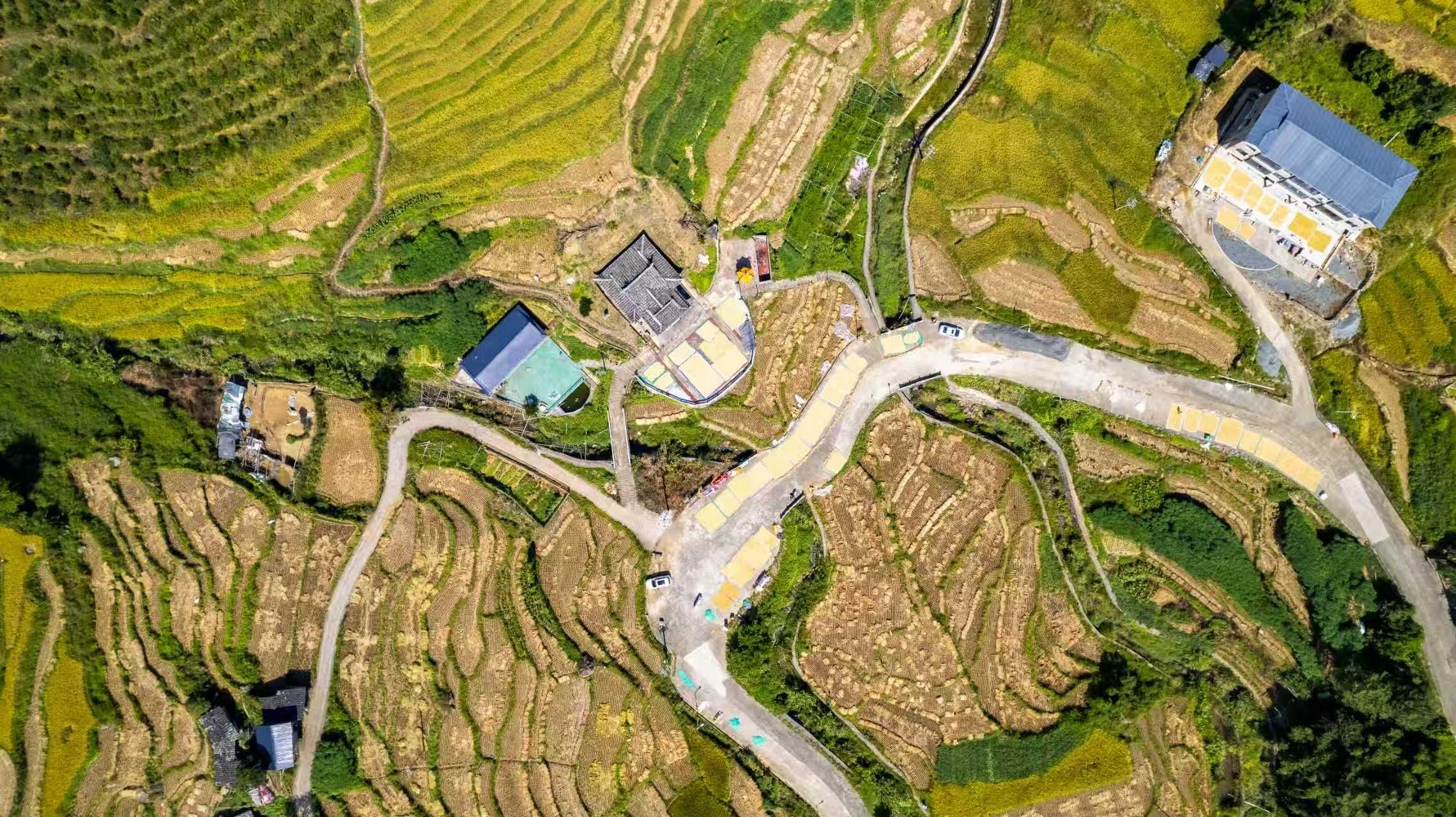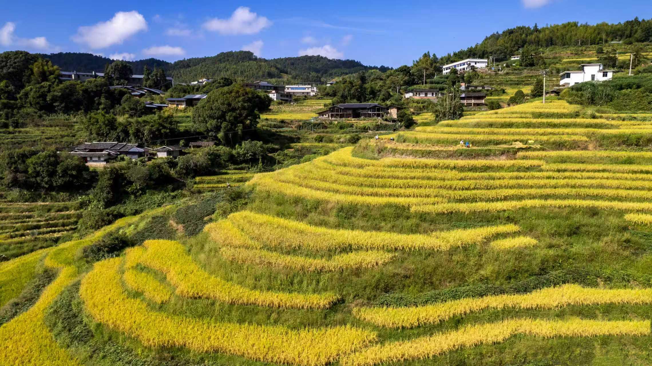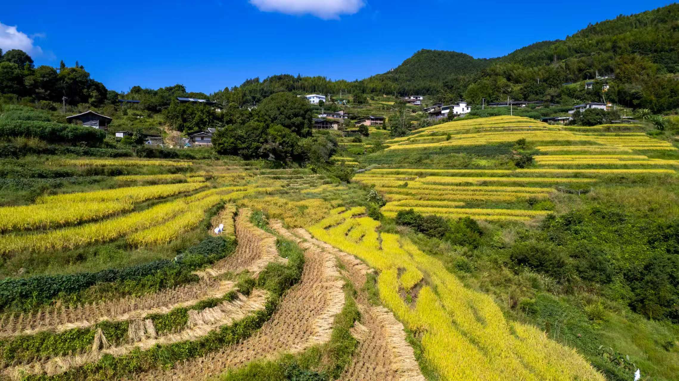 从空中俯瞰,部分已收割的田块与金黄稻浪交错分布,微风拂过,稻浪翻滚,颗粒饱满的稻谷在阳光下泛着诱人光泽。金色梯田与青绿山林、古朴村庄相映成趣,宛如天然调色板。