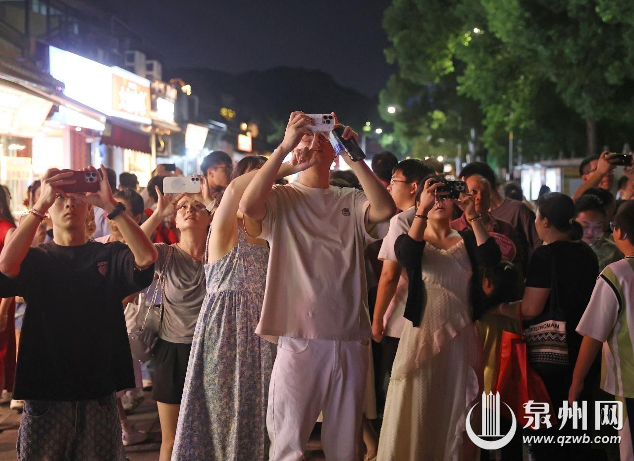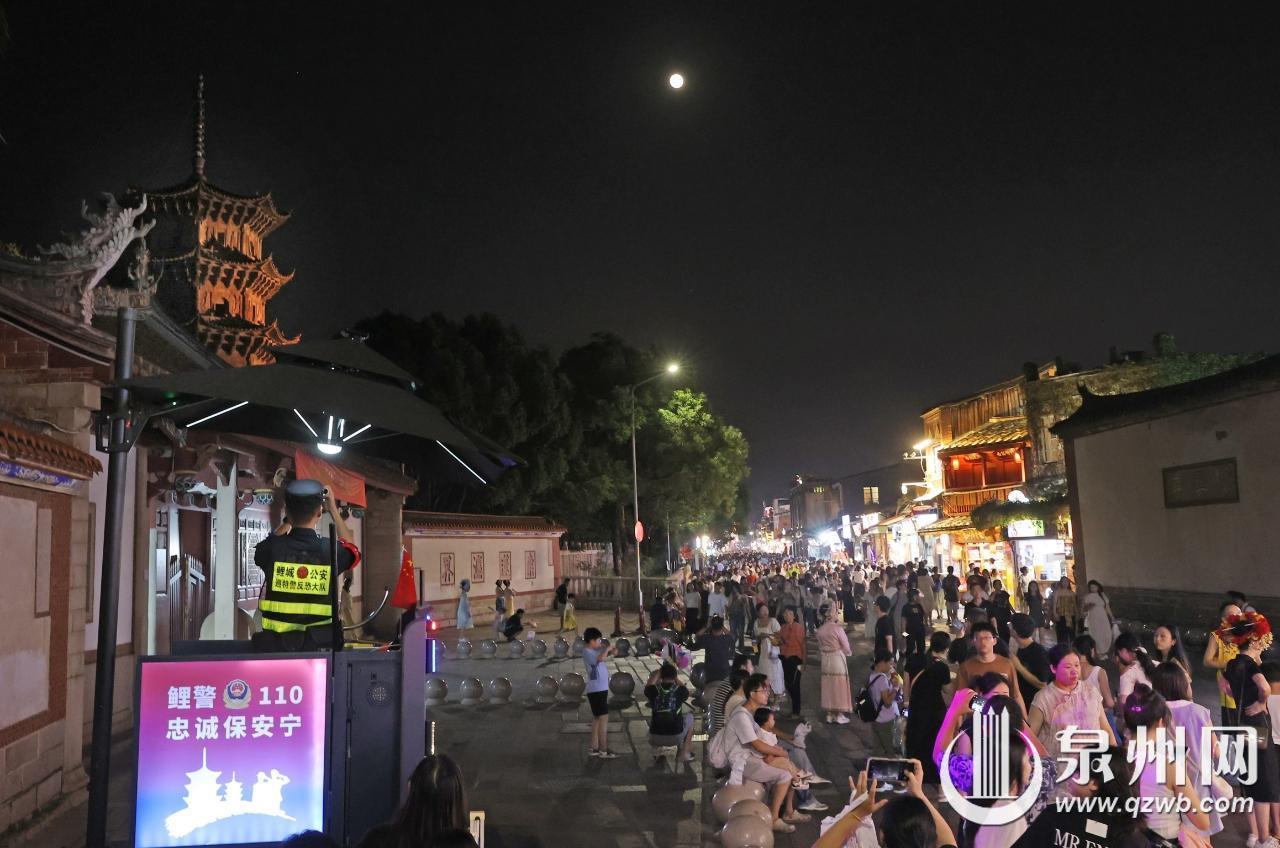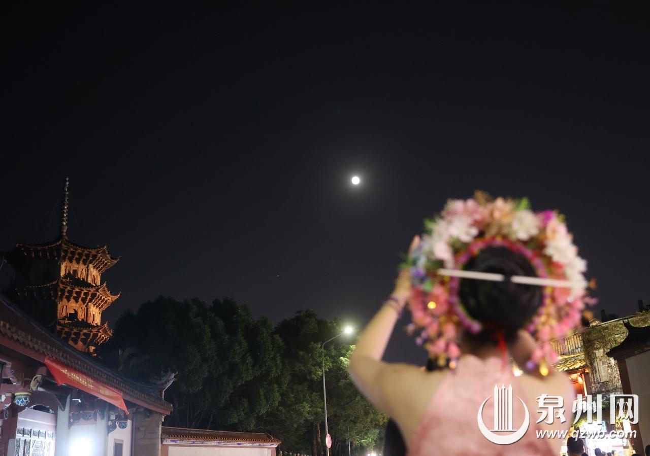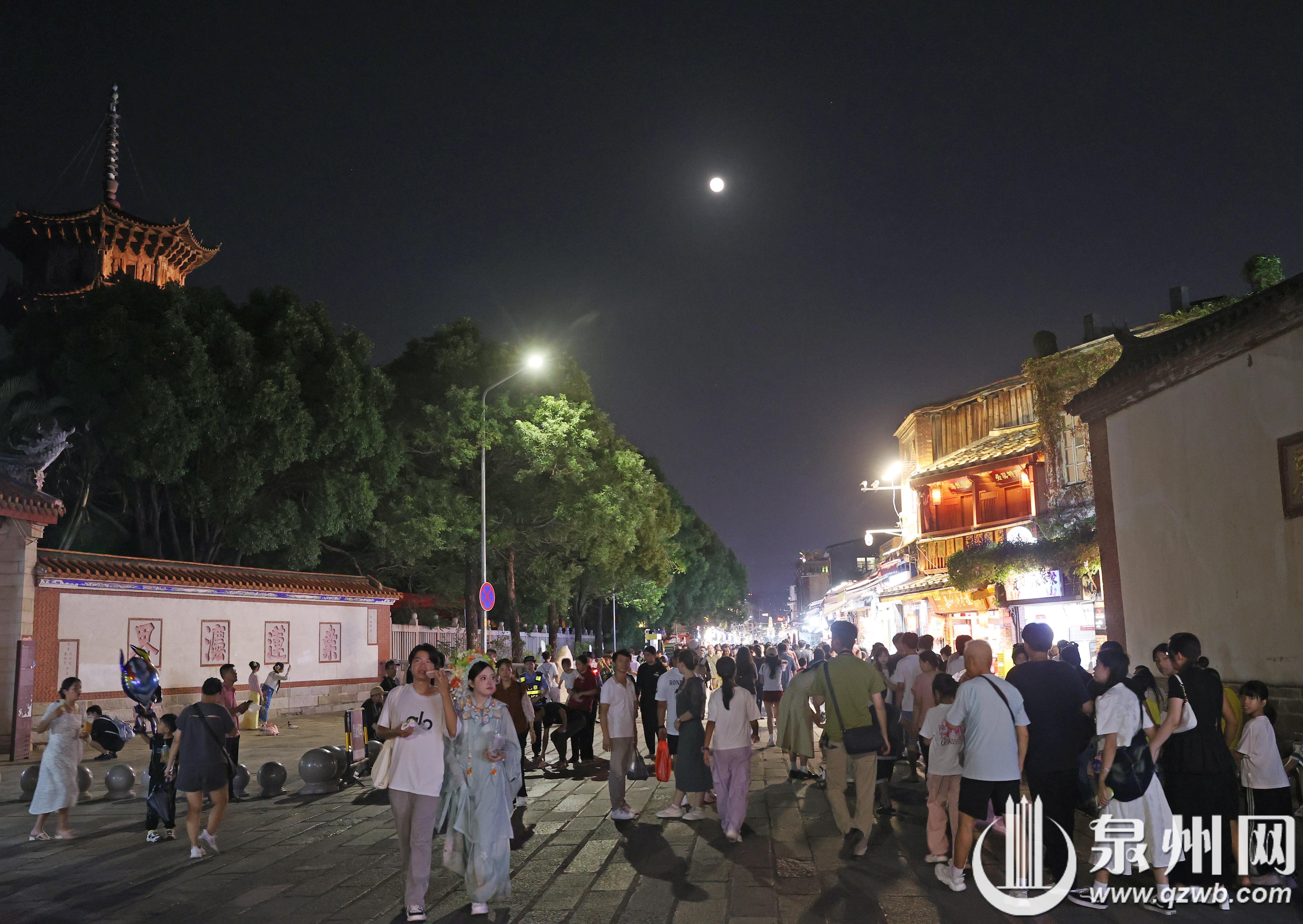 中秋佳节,泉州古城霓虹璀璨,皓月当空,众多市民与游客漫步街头,品美食、赏月色、看美景,感受传统节日的浪漫氛围,尽享花好月圆的团圆时光。(王柏峰 摄)