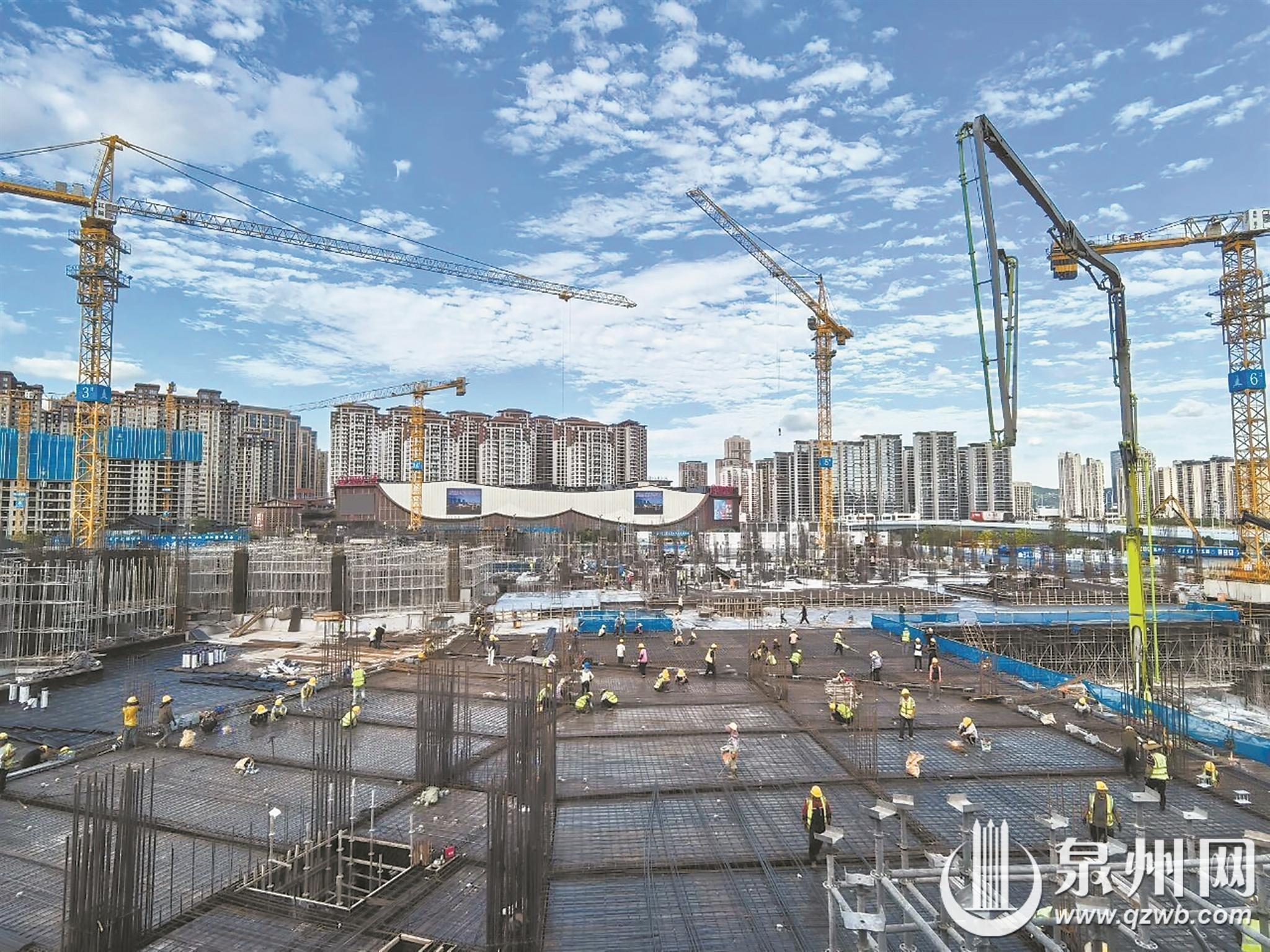 在泉州演艺剧场综合体及商业配套街区项目施工现场,机器轰鸣、车辆往来穿梭,施工人员分布在各个区域有序作业,演艺剧场、商业街区、酒店等三个区域同步施工,呈现一片热火朝天景象。目前,该项目三个区域均在进行主体结构施工。节前,项目部提前部署人员力量,节假日期间每天均有约750名施工人员在场作业,确保项目建设按计划有序、快速推进。