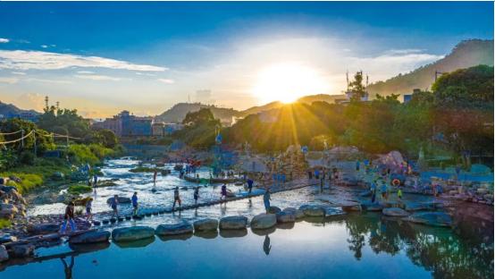 金谷溪岸文艺村由金谷籍乡村能人、国际著名艺术家陈文令2021年从北京返乡出资创建而成,他秉持就地取材的理念,巧妙选用溪中的石头、废弃民房的材料作为设计原料,让这里拥有“不可山寨”的独特气质,漫步于此,人与自然和谐共生似乎具象化了。