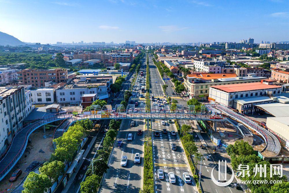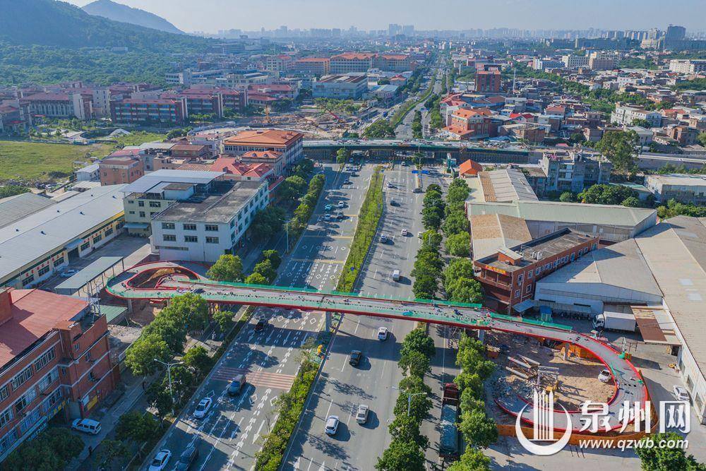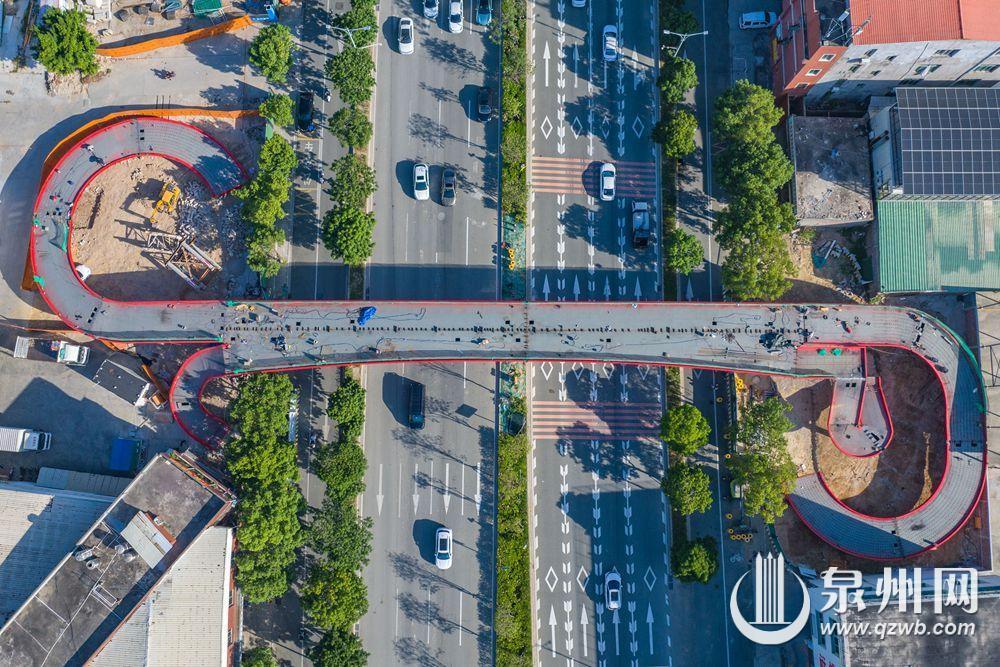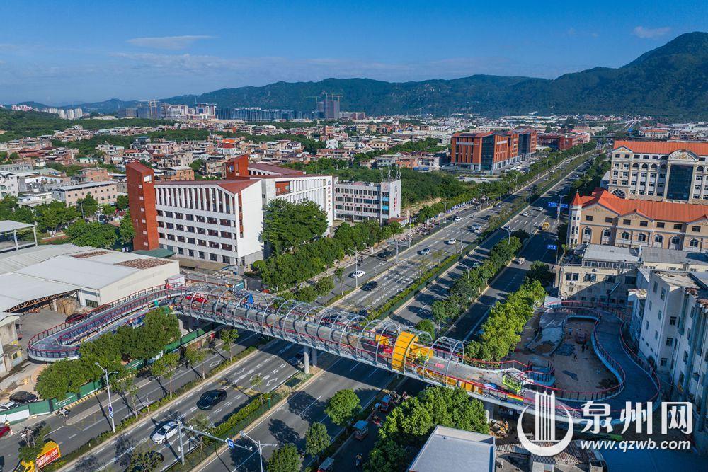 记者从泉州文旅集团获悉,市区普贤路群石小学过街天桥、群山社区过街天桥施工进展顺利,目前均已完成桥梁吊装。两座过街天桥投用后,将缓解路段交通压力,减少车道与人行交通互相干扰,提高群众出行的安全性。图为群石小学过街天桥。(融媒体记者陈起拓 宋尧 摄)
