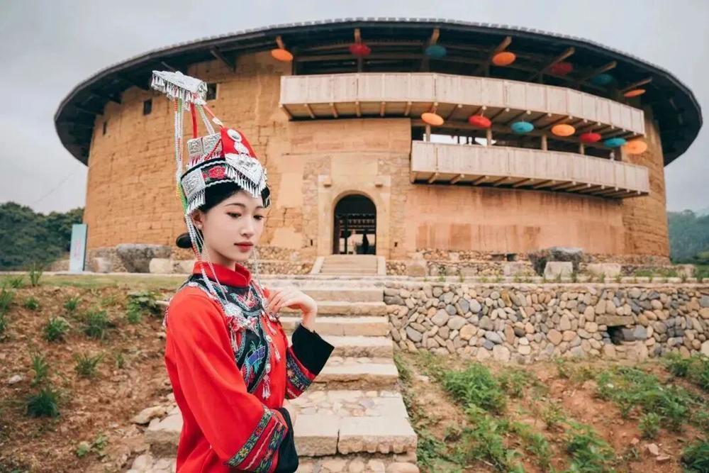 女生把自己与福建圆形土楼的合影修得色调温润 (图源:清爽华安)