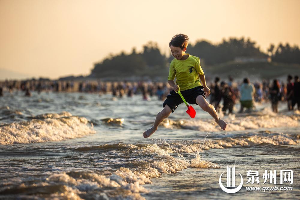 国庆假期里,小男孩在泉州海边留下欢乐的身影。(陈起拓 摄)