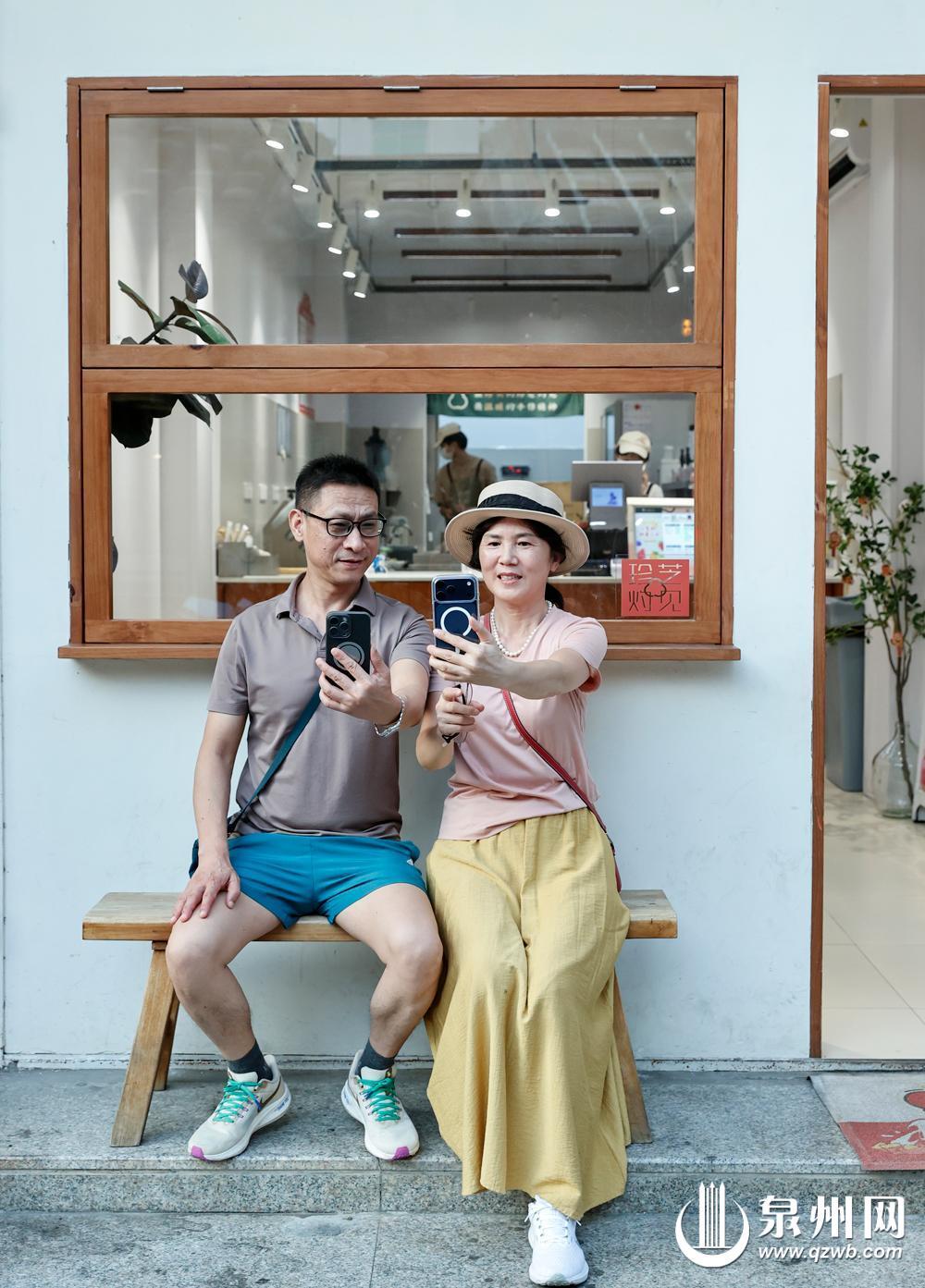 国庆假期里,湖北的陈先生和妻子在泉州花巷的小店前拍照留念。(泉州晚报资料图)