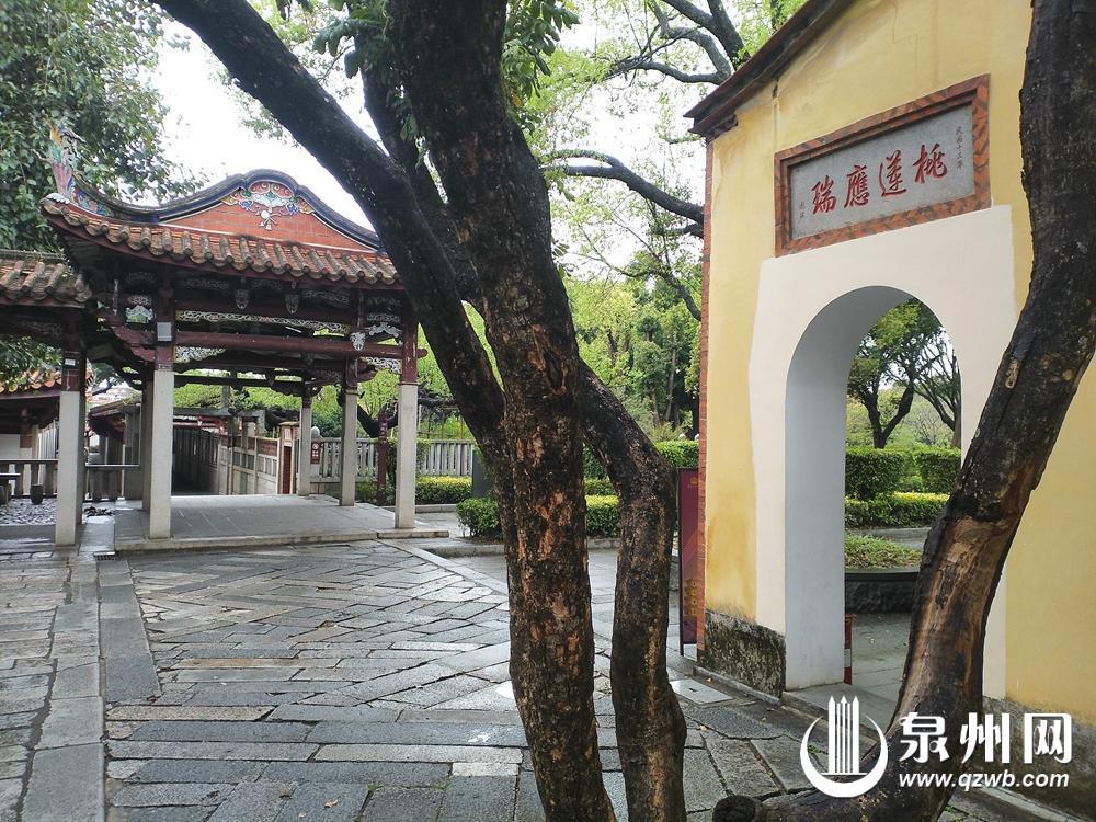 开元寺内,桑莲古迹旁,尊胜院东面拱形门上可见“桃莲应瑞”四字石匾。据说,桑莲古迹与“桃莲应瑞”石匾之间,正是当年“桃开红莲”传说的所在。