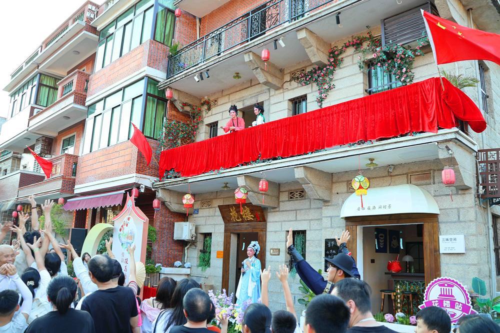 “荔枝若有坠楼恨,拼向瑶阶碎玉琴”,随着讲古人一声韵味悠长的闽南语念白,桥南古街花楼的红砖古厝的廊下骤然响起南音琵琶的清越旋律,吸引众多市民游客驻足观看。