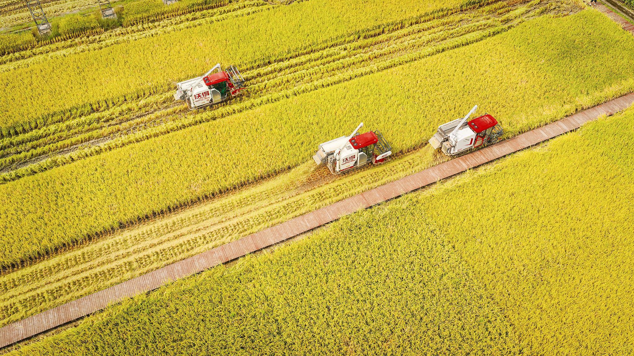 △2025年9月14日,四川成都崇州市隆兴镇十万亩粮食综合示范基地水稻喜获丰收。