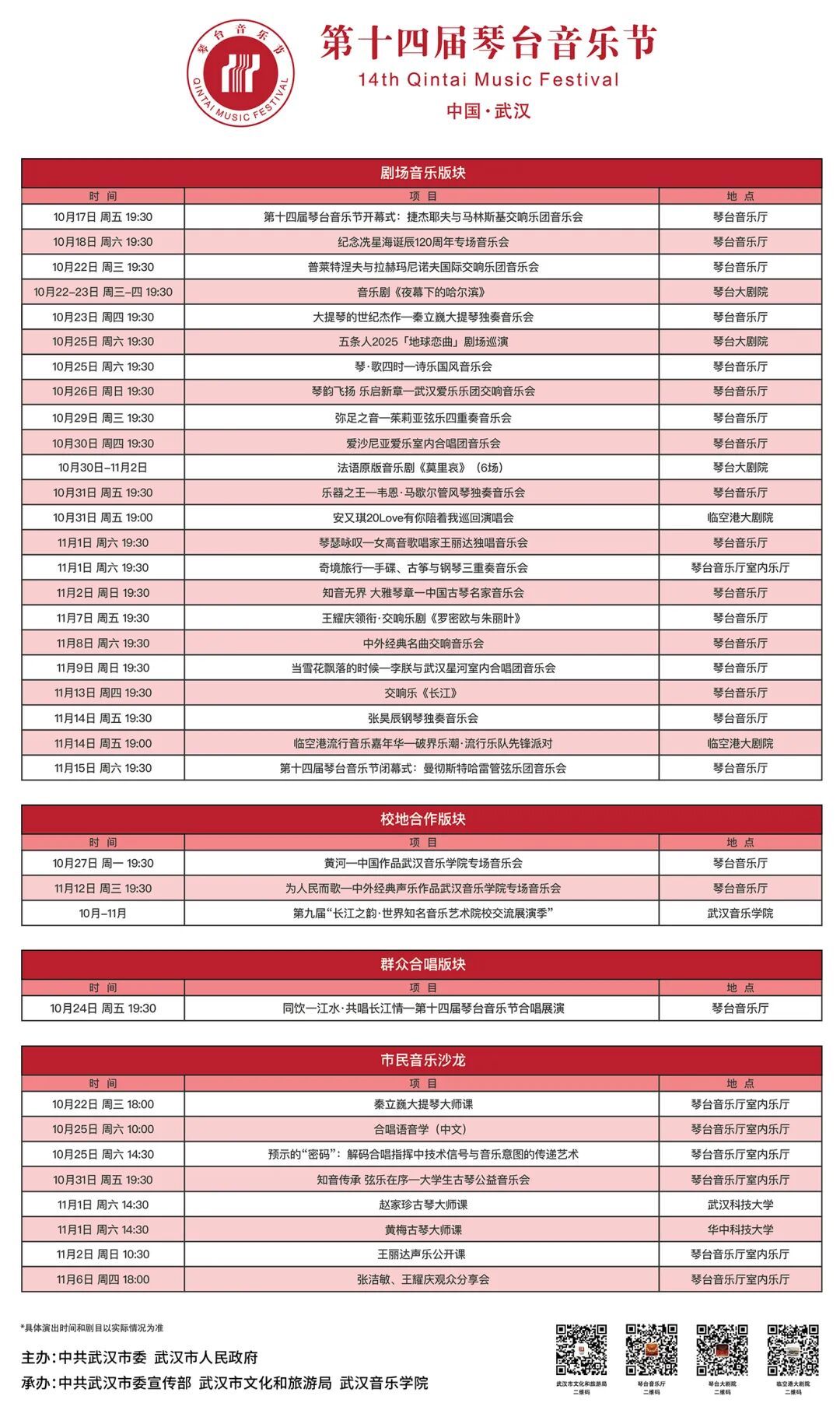 本届琴台音乐节将持续至11月15日,设有剧场音乐、群众合唱、校地合作、市民音乐沙龙四大板块。来自14个国家和地区的音乐家及演出团体将通过线上线下相结合的方式,奉献50余场高质量演出。