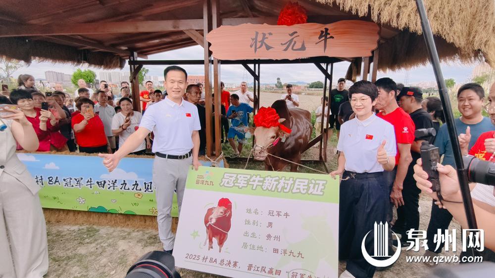 泉州网10月21日讯(融媒体记者 吴水保 王耿华 文/图)状元故里来了“冠军牛”,牛气冲天。19日,承载着赛事荣誉与体育精神的“冠军牛”安家晋江池店镇田洋九九景区,全国“村BA”的冠军荣耀在状元故里书写新篇,为乡村文旅发展注入鲜活力量。