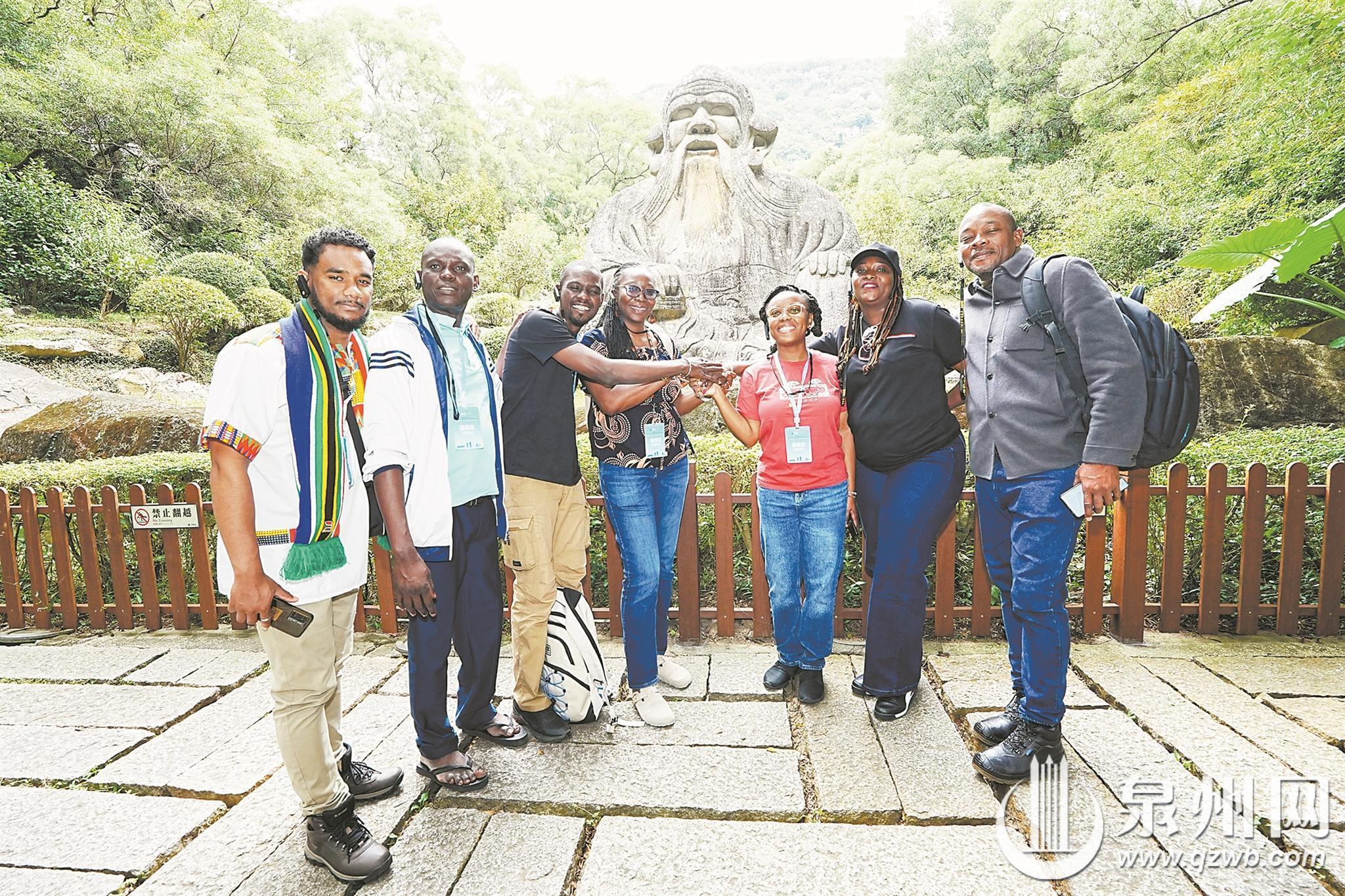 随后,考察团乘车前往清源山。抵达老君岩前,嘉宾们立刻被这尊中国现存最大、最古老的老子石雕吸引。他们不仅集体合影,还各自摆出创意姿势“打卡”。