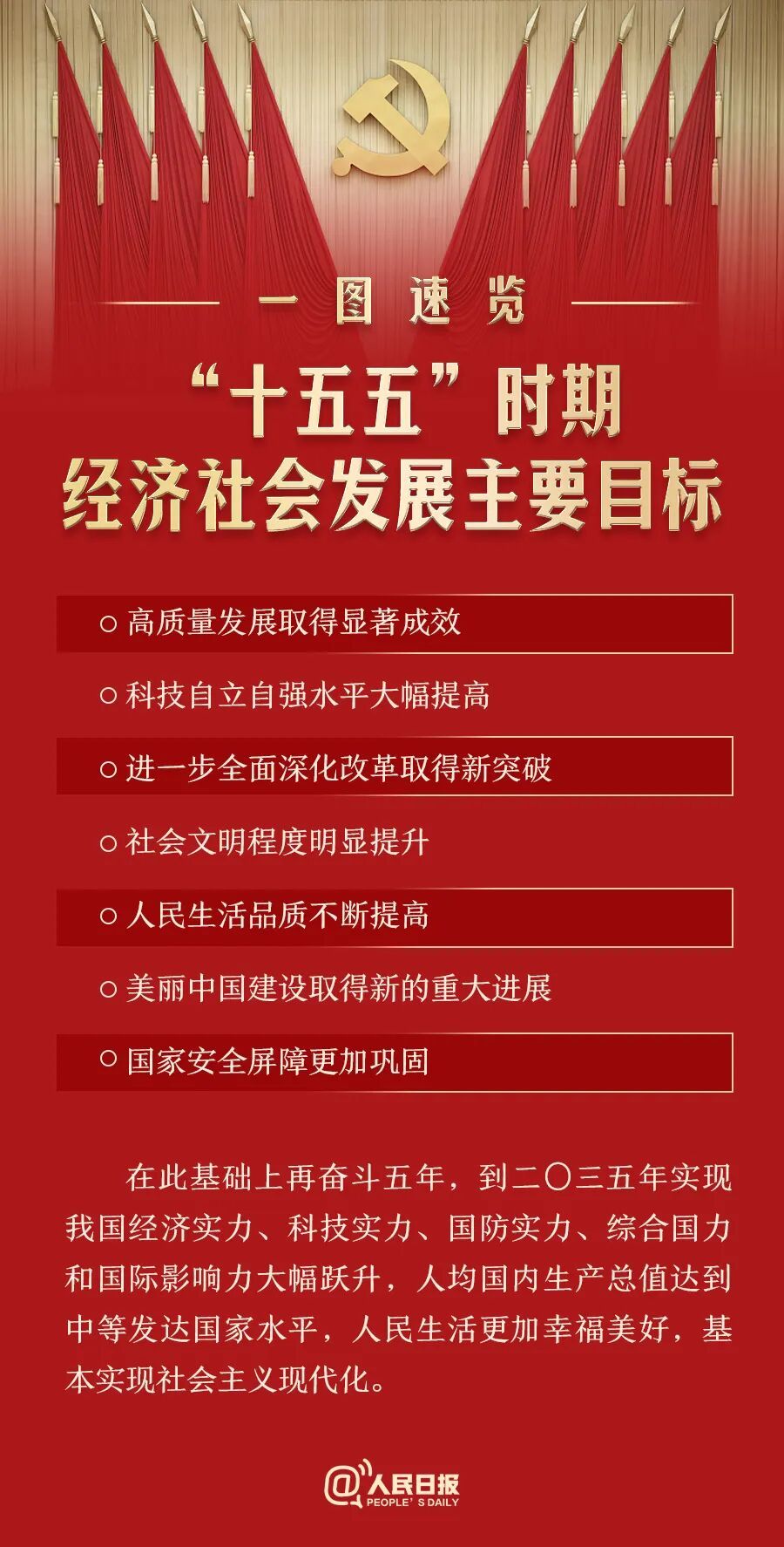 在此基础上再奋斗五年,到二〇三五年实现我国经济实力、科技实力、国防实力、综合国力和国际影响力大幅跃升,人均国内生产总值达到中等发达国家水平,人民生活更加幸福美好,基本实现社会主义现代化。