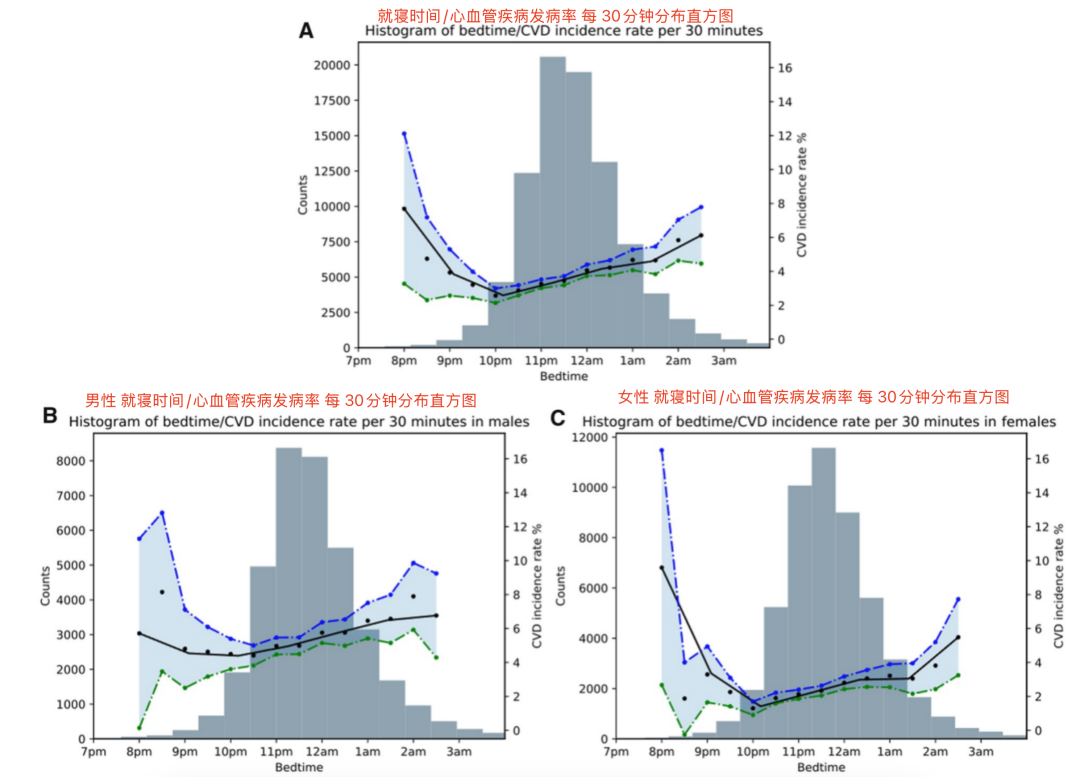 睡眠开始时间与心血管疾病发病率之间的关系,(A)总体样本(B)男性(C)女性。