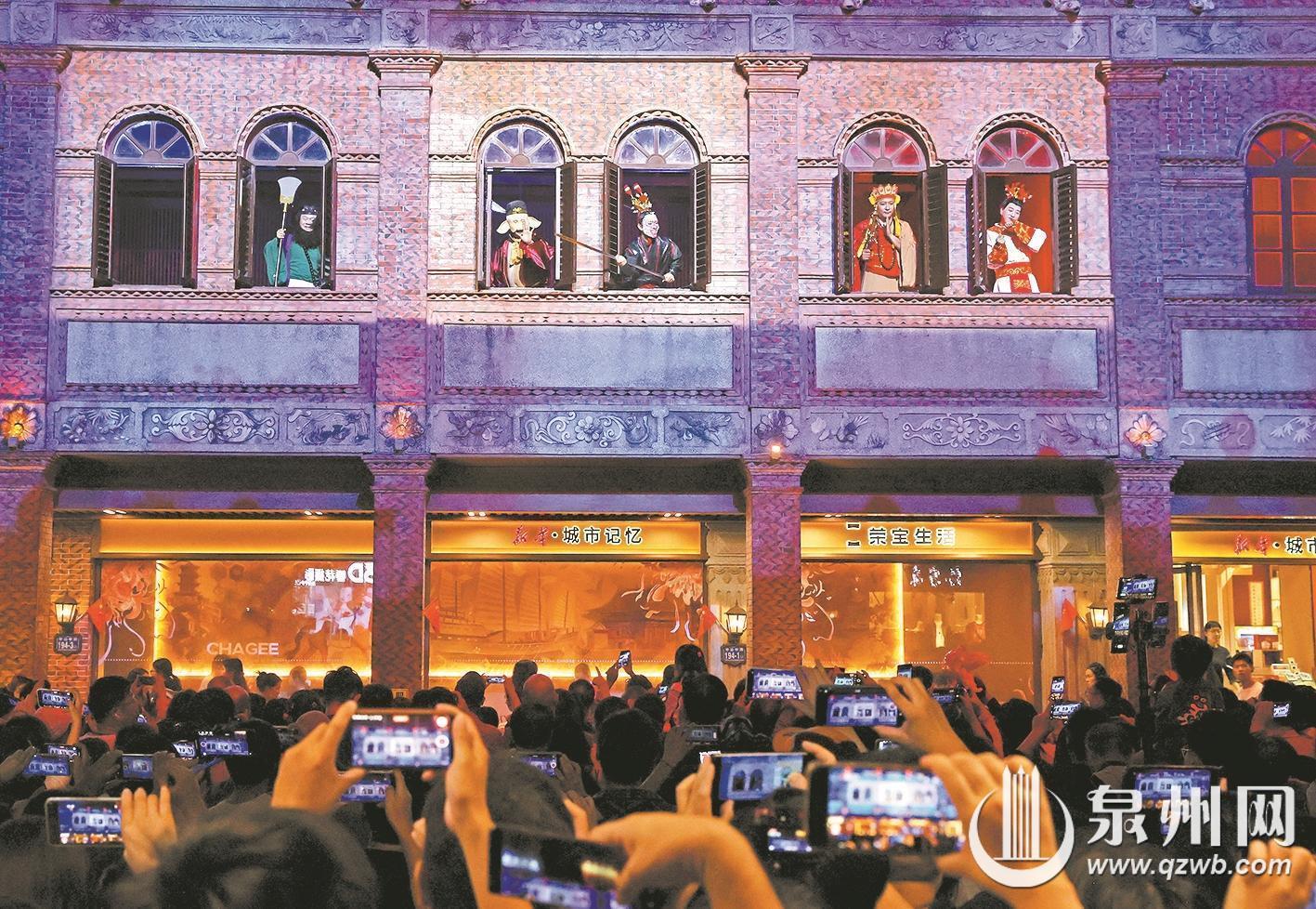 昨晚,泉州中山路“刺桐幻幕”推出全新创排的国潮动漫主题演出,融合AR投影与光影特效技术,打造沉浸式观影空间,“圈粉”众多市民和游客。(融媒体记者王柏峰 摄影报道)