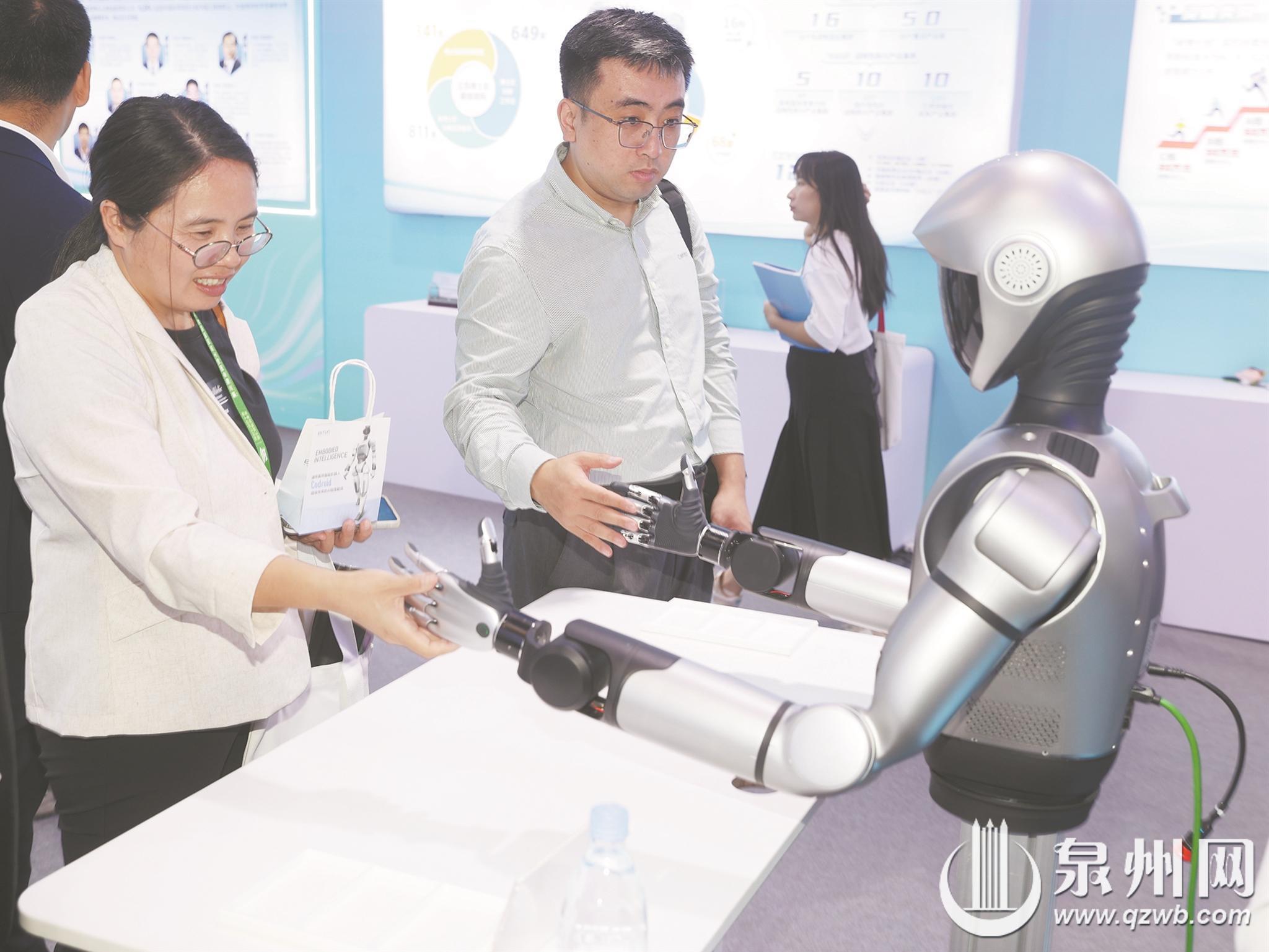 昨日上午,晋江国际会展中心A馆的交流对接活动中,人工智能等创新创业成果展示遍地开花,让大众饱览一场技术盛宴。在安徽省展区,一台智能机械臂在工作人员操控下,可以灵活抓取塑料瓶等物品,吸引众多观众驻足。